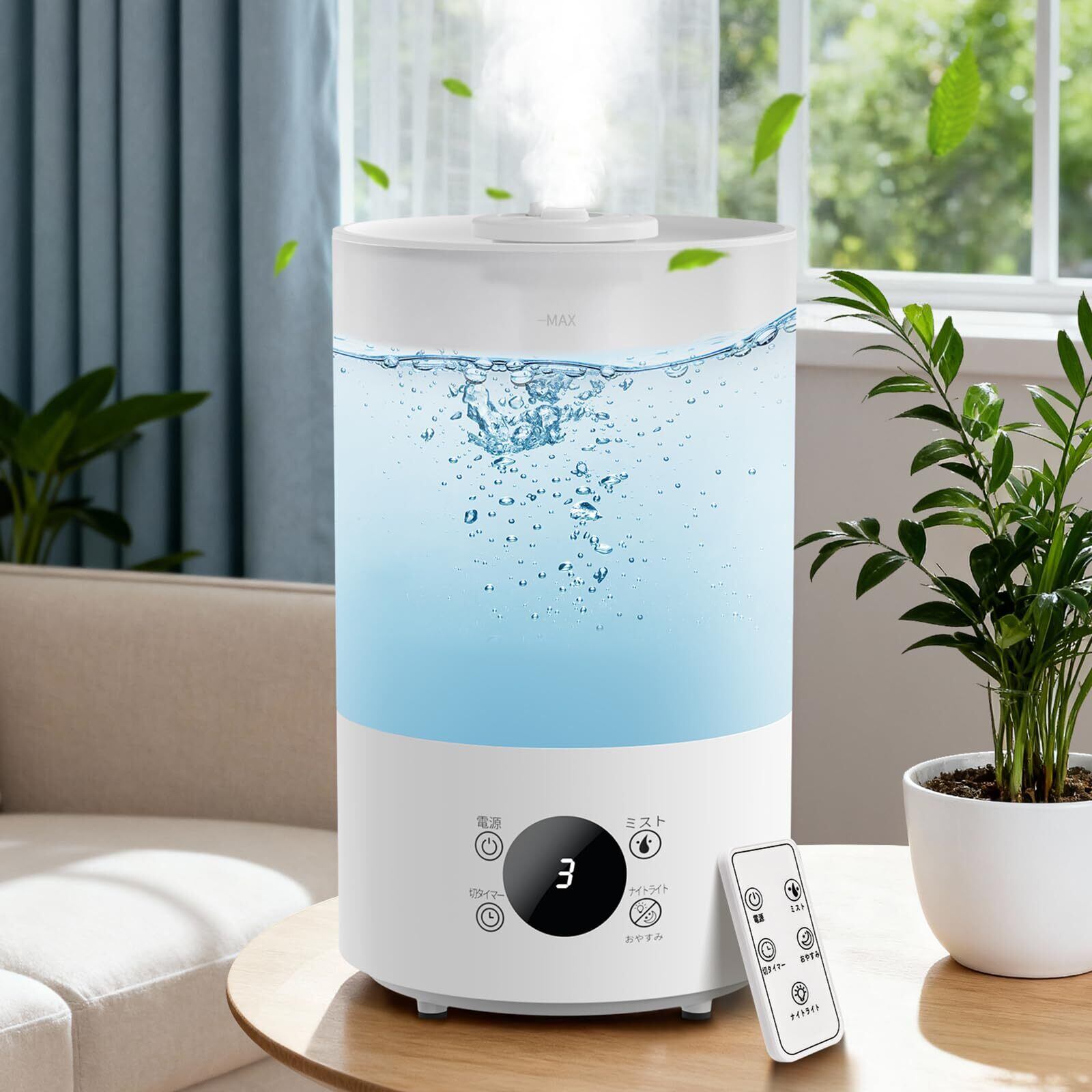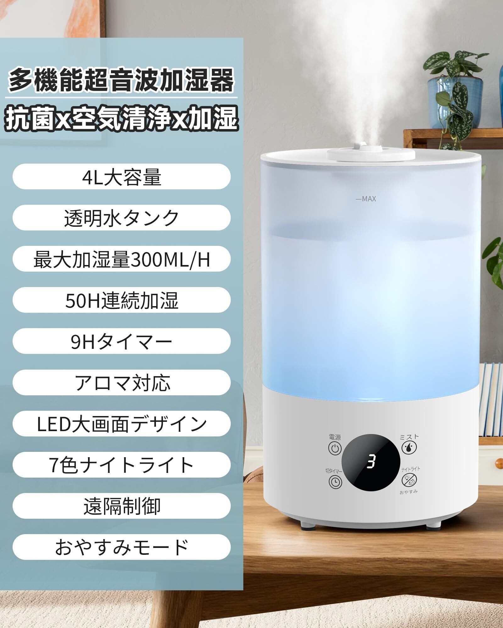 【人気商品】【 限定ブランド】加湿器 大容量 4L 超音波式 卓上加湿器 アロマ対応 上から給水 おしゃれ 加湿機 最大噴霧量300ml/h 50時間連続作動 切タイマー ダブル吹出口360°調整 おやすみモード付き 静音 空焚き防止 省エネ リモコン付き 消灯可能 乾燥対策/花粉症対策 寝室/オフィス/会社/家庭用 日本語取扱説明書 PSE認証済み