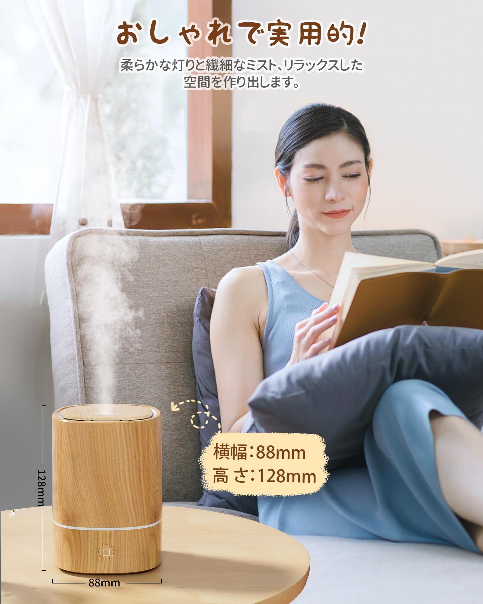 【オートオフ空焚き防止&使用上の注意点】水の量は容器の3分の2以下(上から2.5cmまで)にしてください。満水にするとミストが出にくくなります!使用時はまず最初に電源を設置してから、外蓋を外して内部容器に水およびアロマオイルを入れてください。水が電源に濡れるのを防ぐためです。アロマディフューザーアロマオイルを使用することで超音波スプレーにより香りをお部屋の中に広げ、アロマディフューザーとして機能します。また、エッセンシャルオイル未使用時では、水だけを使用してミニ加湿器としてあなたのそばに潤いをもたらします。