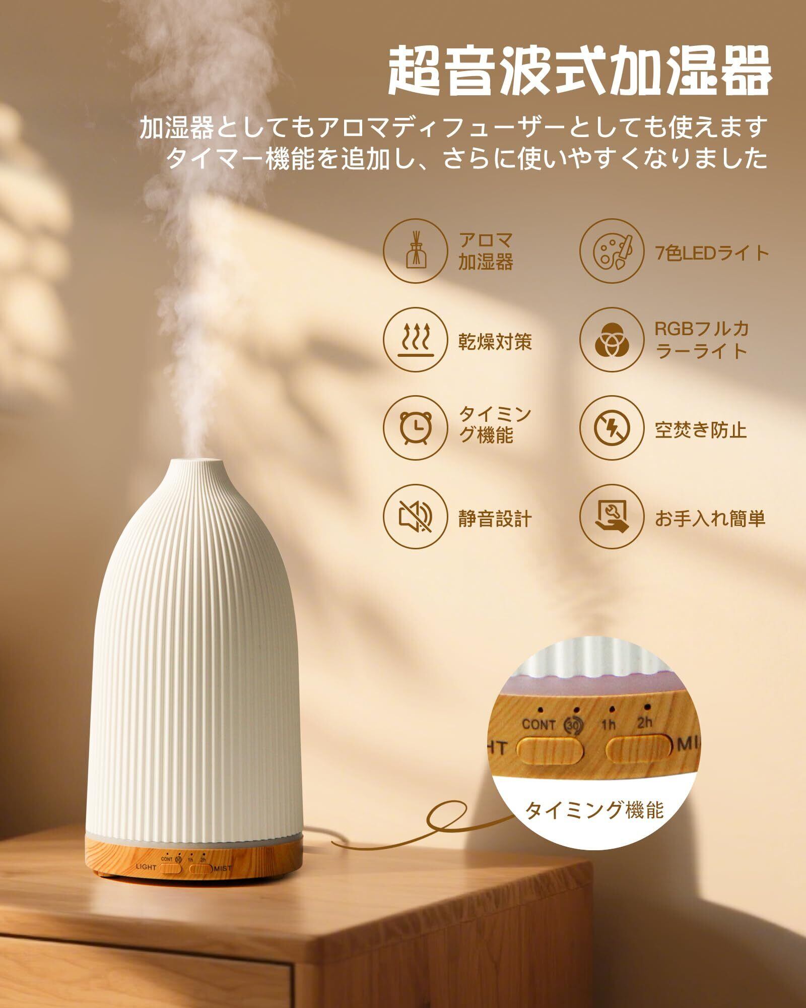 【2025発売新モデル加湿器・タイマー機能搭載】加湿器 小型 アロマディフューザー アロマ対応 7色LEDライト 超音波式 静音 省エネ 卓上 自動停止機能 空焚き防止 デスク 寝室 オフィス 車用 リビング 乾燥 花粉症対策 (ホワイト)