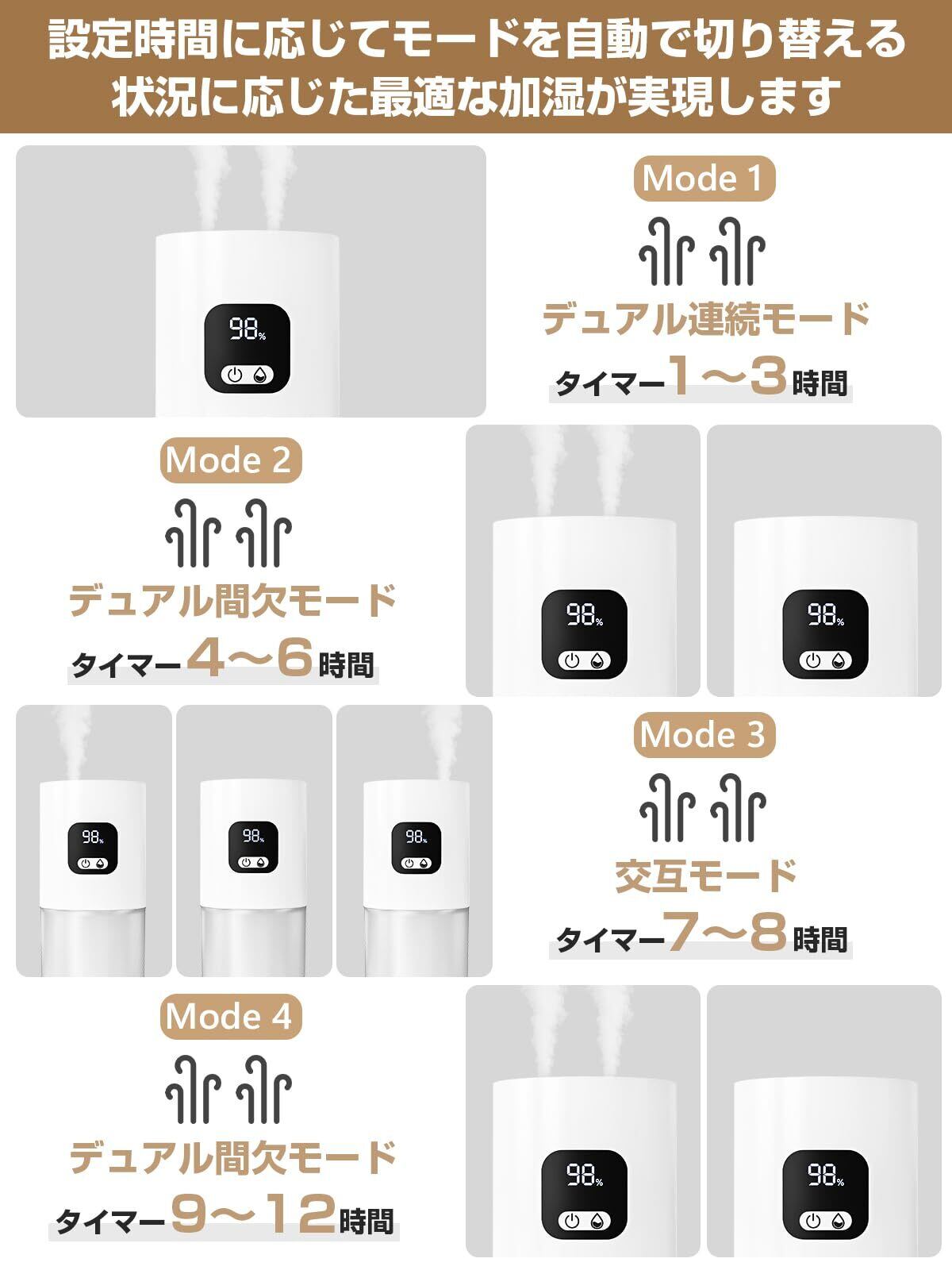 【タイマー機能 & 自動モード切替】1~12時間の12段階から選択可能なタイマー設定。設定時間に応じて「連続ミスト」と「間欠ミスト」モードを自動で切り替えるため、状況に応じた最適な加湿が実現します。