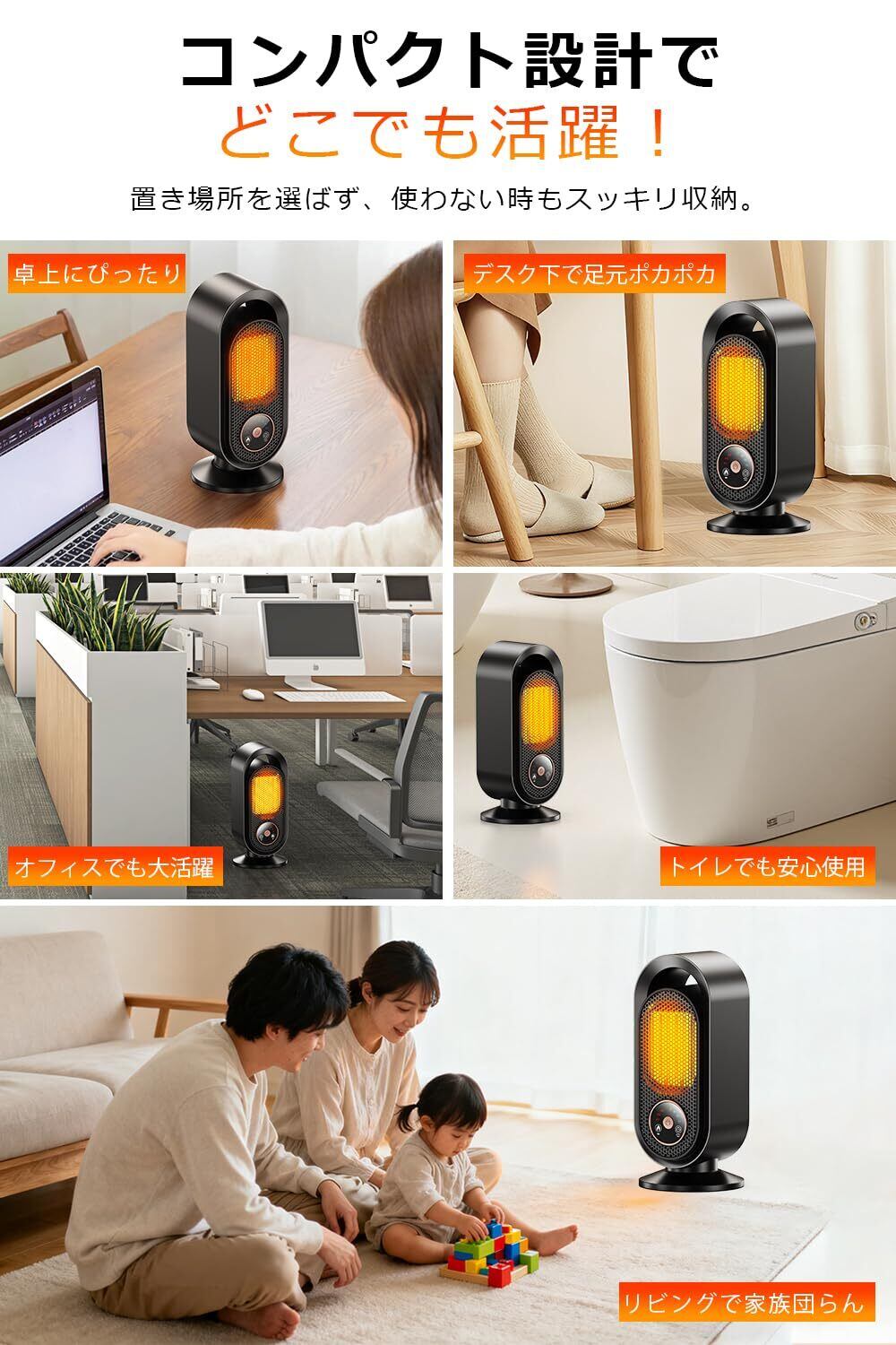 【暖房+空気清浄のW機能搭載。簡単タッチ操作】本製品は、暖房と空気清浄の機能を兼ね備え、より健康的で快適な暖かさをお届けします。内蔵のマイナスイオン発生器により、温風を送りながら高濃度のマイナスイオンを放出し、空気中のホコリやニオイを効果的に除去。清潔で自然な室内空気を保ちます。操作面にはシンプルなタッチパネルを採用し、軽く触れるだけで電源や温度、モードの切り替えが可能。反応が早く、視認性も高いため、複雑な設定は不要です。オフィス、寝室、リビングなど、どんな場所でも理想的な温度と空気環境を簡単にコントロールできます。