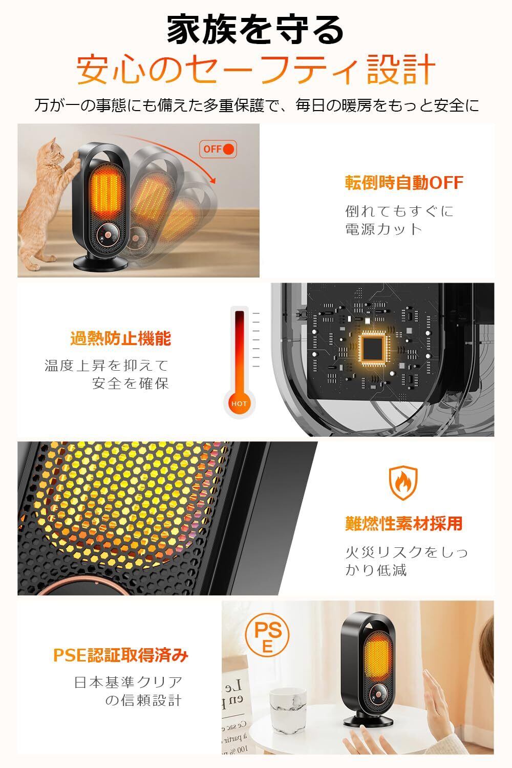 【シンプルな見た目に、確かな安全機能を凝縮】電気ファンヒーターは、暖かさを提供するだけでなく、安全性にも徹底的に配慮しています。本体には転倒時自動電源オフ機能と過熱保護システムを搭載。万が一傾いたり倒れたりしても瞬時に電源が切れ、事故を未然に防ぎます。内部温度が異常に上昇した際にも自動で加熱を停止し、安全を確保します。外装には耐熱性の高いABS難燃素材を採用し、高温でも変形しにくく優れた耐燃性能を発揮。日本のPSE認証を取得しており、安全基準にも適合しています。ペットのいるご家庭でも安心してお使いいただけます。