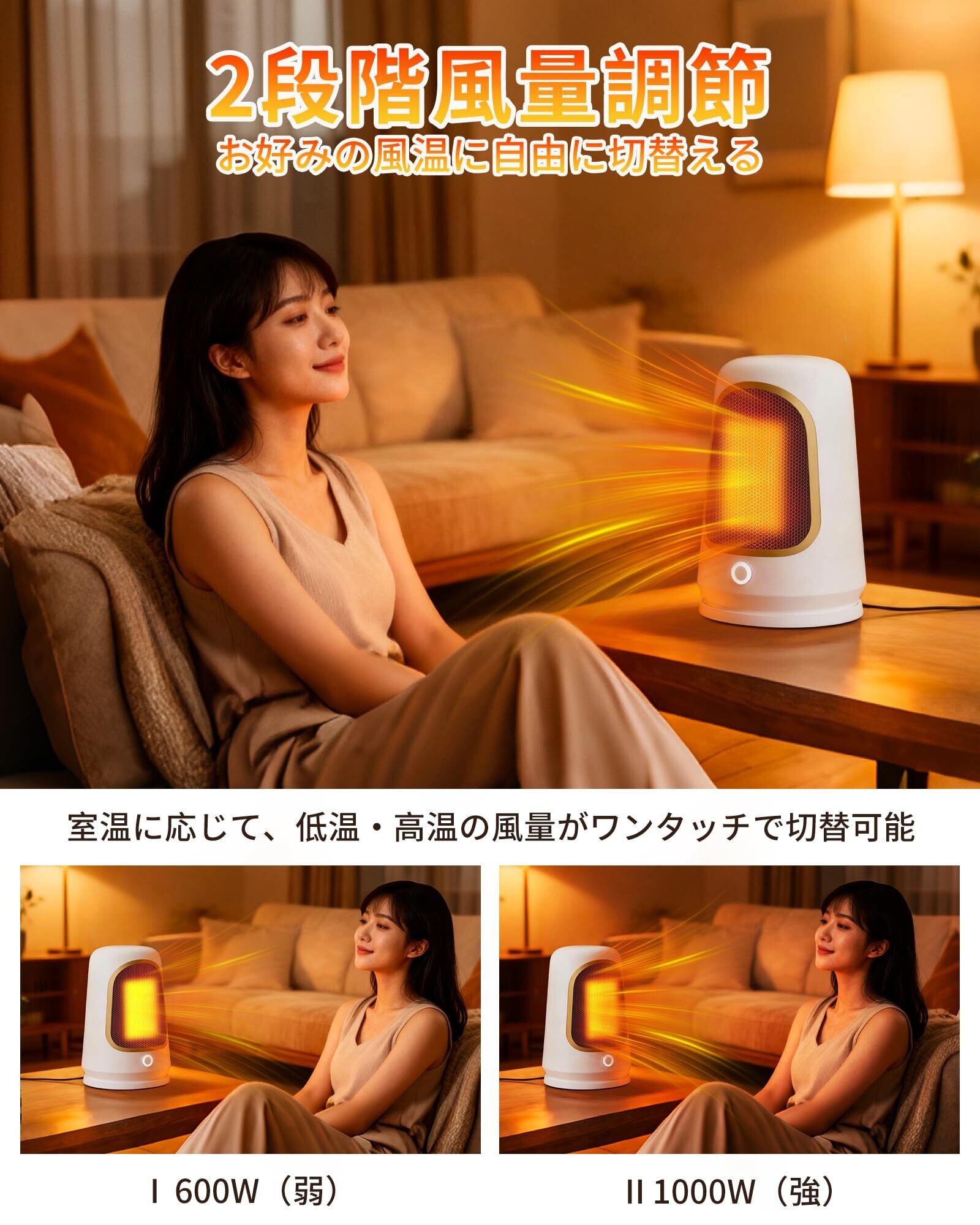 【2段階切替・省エネECOモード搭載】電気ヒーターは省エネ600Wと強力1000Wの2段階温度に対応し、600Wは省エネで穏やかな暖かさを提供し、パーソナルスペースに最適。1000Wはパワフルな熱風で、お部屋全体をすばやく温めます。使用シーンや部屋の広さに合わせて自由に調整でき、寝室や書斎、オフィスなど、あらゆる場所で快適な暖かさを保ちます。高集積パワーチップとECO省エネモードにより、無駄な電力を徹底カット。一般的な電気ヒーターに比べて電気代を40%以上節約でき、毎日使ってもしっかり暖かく、家計にもやさしい省エネ設計です。