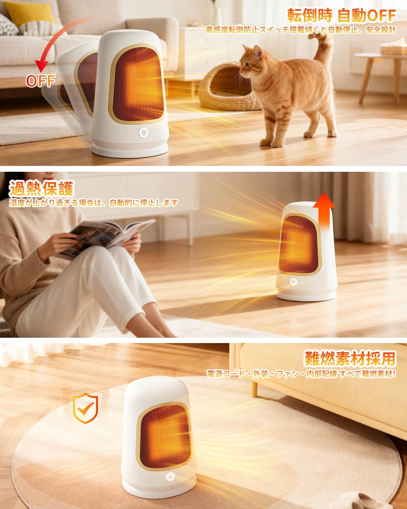 【安全性強化・多重保護&PSE認証済み】電気ファンヒーターは暖かさだけでなく、安全性にも徹底配慮。➊高感度の転倒防止スイッチ:不注意で転倒した場合、電源が自動で切れ安全を確保。(※柔らかいカーペット上では転倒防止機能が作動し、運転が停止する場合があります。)➋過熱保護機能:内部温度の異常上昇を検知すると、自動的に加熱を停止し事故を防ぎます。➌難燃素材採用:V-0級ABS難燃素材を使用し、発火リスクをさらに低減。➍PSE認証取得:日本の電気用品安全法に適合した安心設計。小さなお子様、高齢者、ペットのいるご家庭にも最適な 安全暖房器具です。