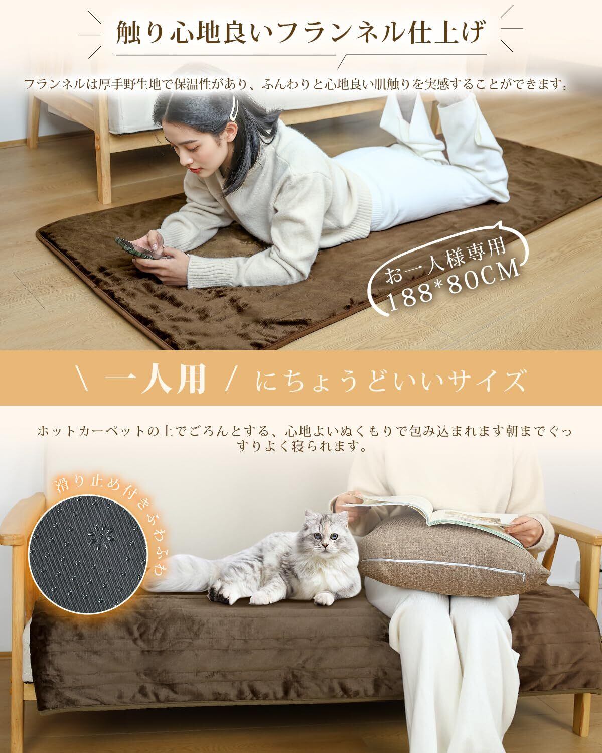 ホットカーペット 1畳 188×80cm 電気カーペット 4段階温度調節 10Hタイマー 電気毛布 敷き シングル 省エネ ホットマット 一人用 ダニ退治 3分速暖 切り忘れ防止 暖房器具 フランネル仕上げ 収納簡単 ごろ寝マット 床/ベッド/ソファ 足元 防寒 PSE認証済 冷え対策 (ブラウン)