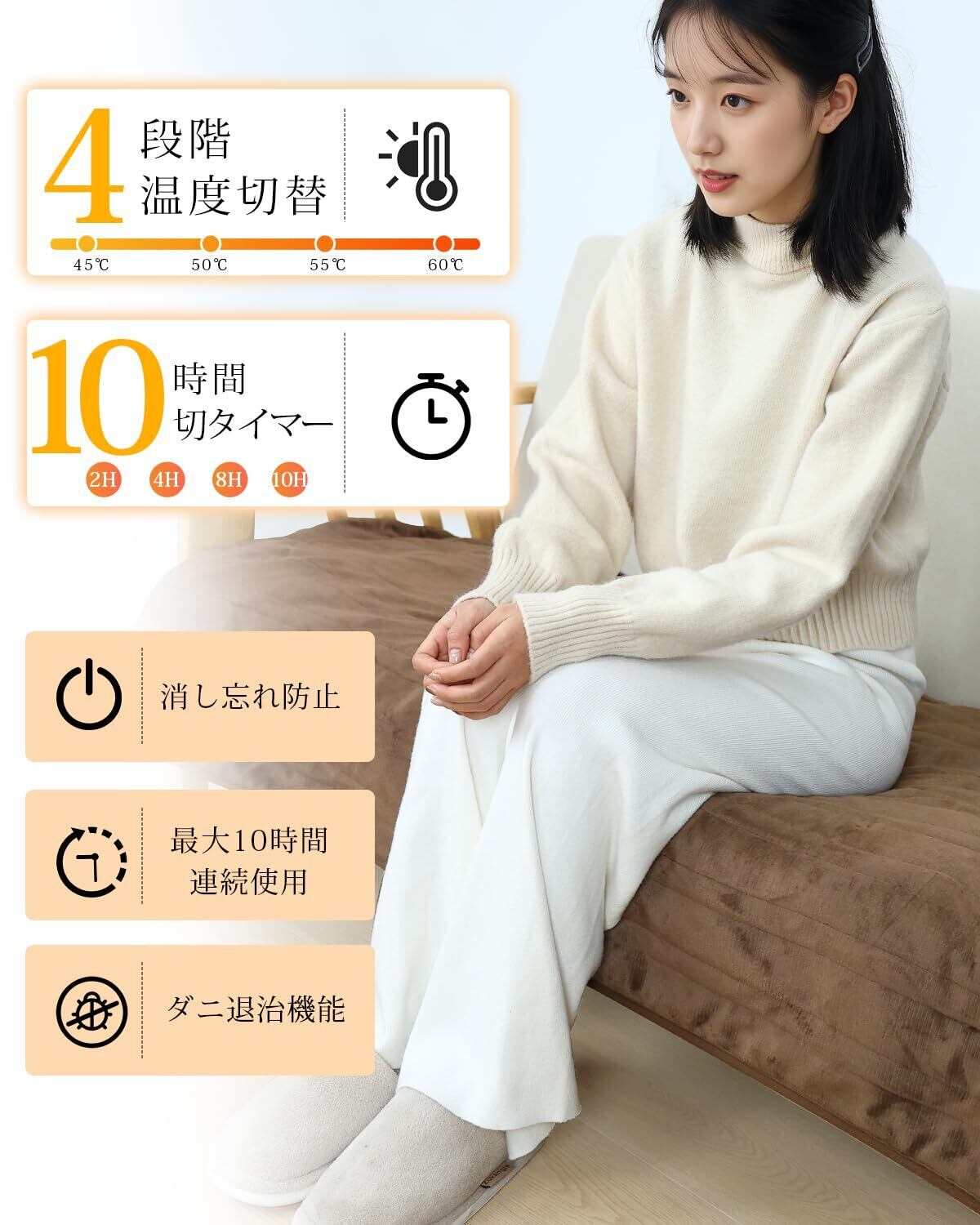 【上質フランネル・ダニ退治機能・お手入れで長持ち】肌に触れるたびに、思わず顔がほころぶような「ふわっ」とした質感をお届けします。表面は高品質なふわふわフランネルで仕上げられており、優しい温もりが体を包み込む至福のリラックスを約束するホットカーペットです。また、ご家庭での衛生面にも配慮し、50℃以上の温度で1時間以上運転することで、繊維の奥に潜むダニを徹底的に退治する機能を搭載しています。清潔な温もりを長くお使いいただくために、電気カーペット本体は水洗い不可です。汚れた際は、水でよく絞った柔らかい布で軽く拭き取るという丁寧なお手入れをお願いします。日頃の簡単なお手入れで、末永く快適にこの電気ホットマットをご愛用いただけます。