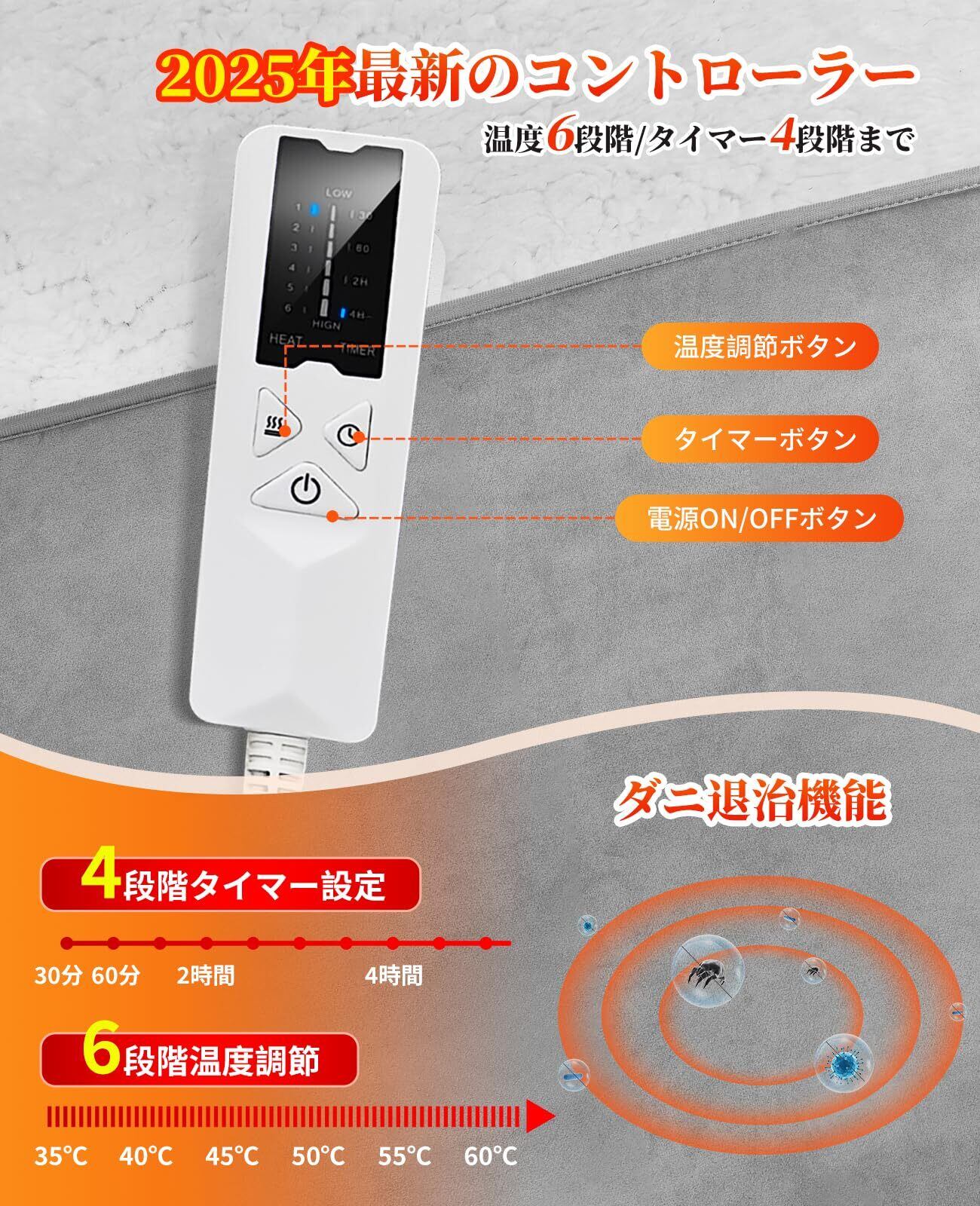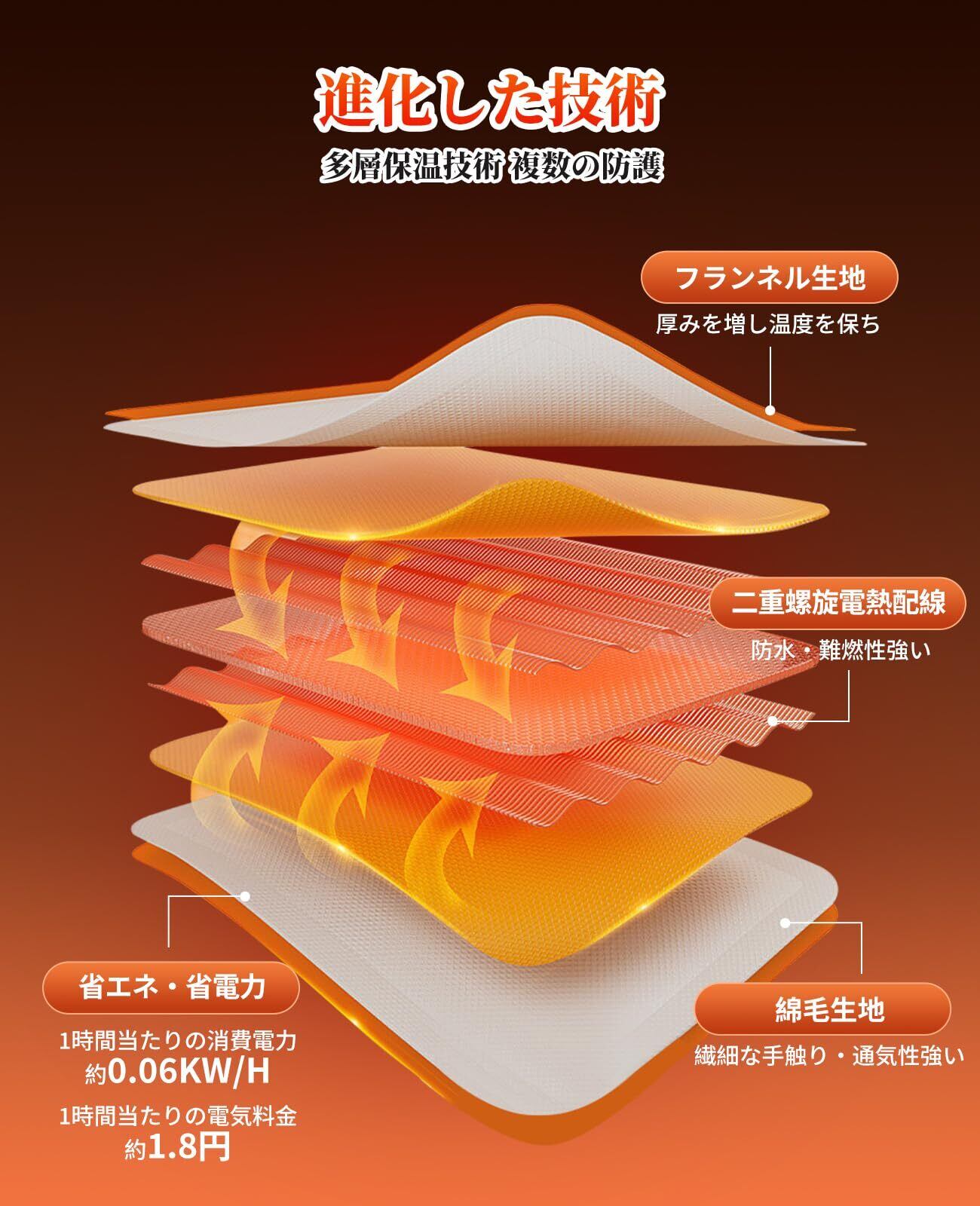 【二重螺旋電熱配線&ダニ退治機能】当社製品は、業界安全基準を大幅に超える多層防御を実現。過熱を即座に検知して電源を遮断する「温度異常センサー」と、万一の際に二重で安全を守る「独立ヒューズ」により、多重安全を確保。さらに発熱部と基盤には耐熱・難燃素材を採用し、素材劣化を抑制しながら、安心して長くお使いいただけます。高温ダニ駆除機能を搭載。コントローラーで温度を6段階に調整可能で、1~2時間の通電で効率的にダニを退治するこができます。