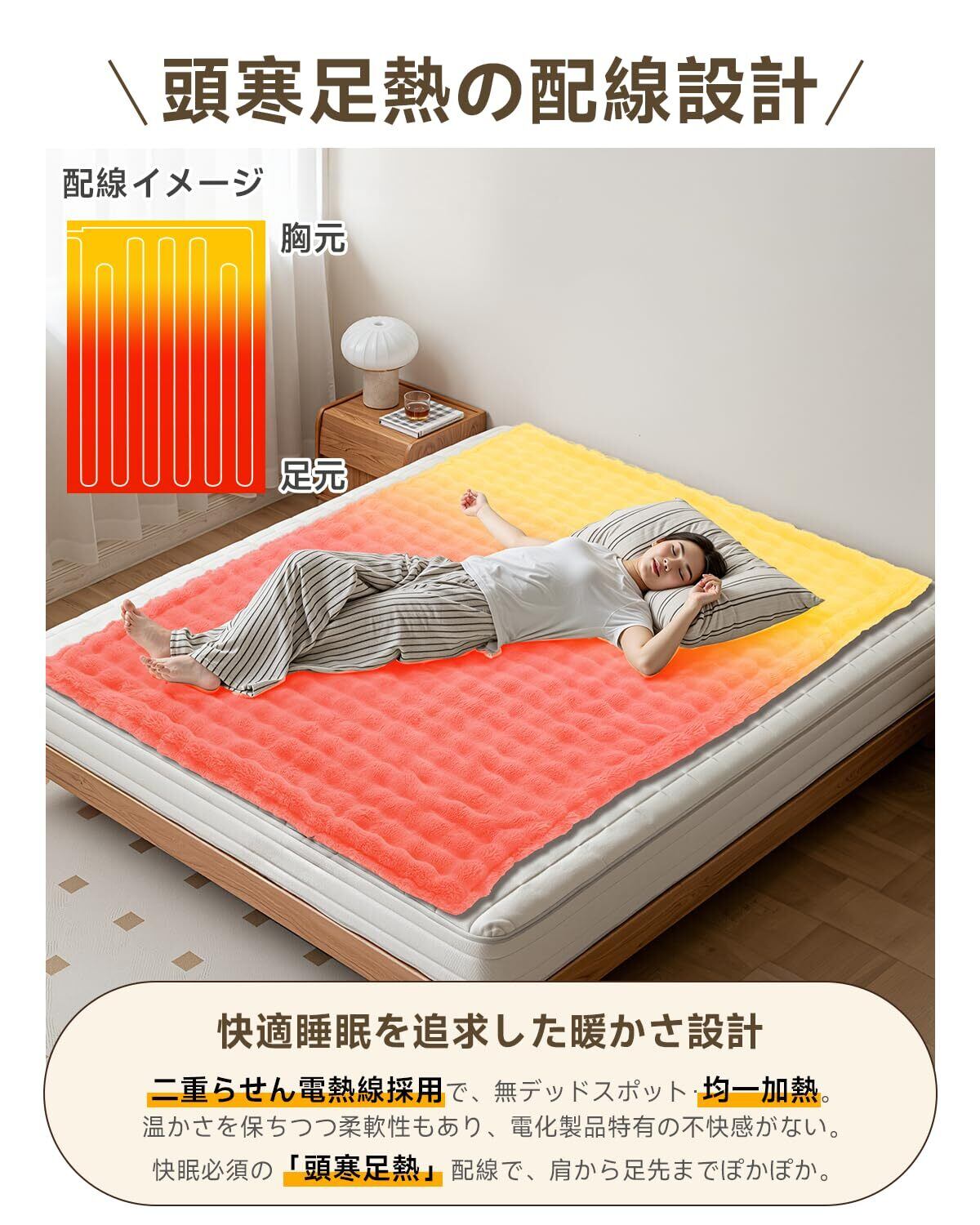 4.頭寒足熱・多重保護でより安心 >>> 人体の保温ニーズに応じて、特別に「頭寒足熱」の科学的設計を採用し、足元エリアに集中ヒーターを配备し、足元に正確に暖を供給すると同時に、上半身の過熱を回避し、快適でバランスの取れた体感温度を作り出し、良質な睡眠をサポートします。製品には専門的な睡眠モードも搭載され、夜間の保温ニーズに自動的に適応し、就寝時の安心感をさらに向上させます。安全保護面でも妥協はありません、過電圧、過電流、短絡、過熱の四重保護メカニズムを内蔵し、且つ権威的な PSE 認証を取得していますので、源から安全上の隐患を回避し、日常使用で心配する必要がなく、家族全員に全方位の暖かい守りを提供します。さらに、本製品は 1 年間の品質を付属しており、お客様のご使用をより安心なものにするため、万が一品質上の問題が生じた場合には迅速に対応させていただきます。