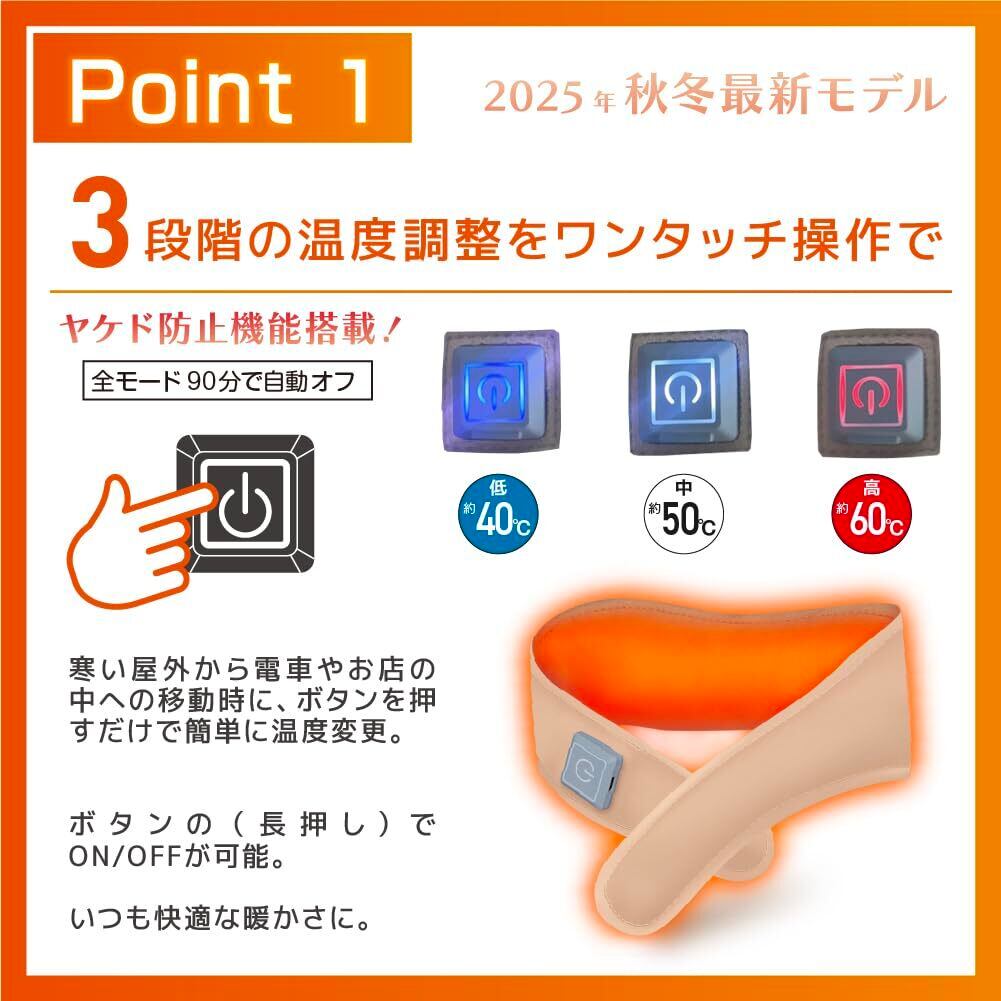 ■ワンボタンのシンプルな操作で使い勝手も抜群です。 40℃、50℃、60℃と温度を選べ、カイロをONにしてから数秒で熱を感じます。 ・40℃低温モード:程よい温かさに抑え、首をあたためます。 ・50℃中温モード:冷感を素早く解消できる速熱。 ・60℃高温モード:屋外の防寒!首がしっかりとあたたまるから全身がポカポカになりま