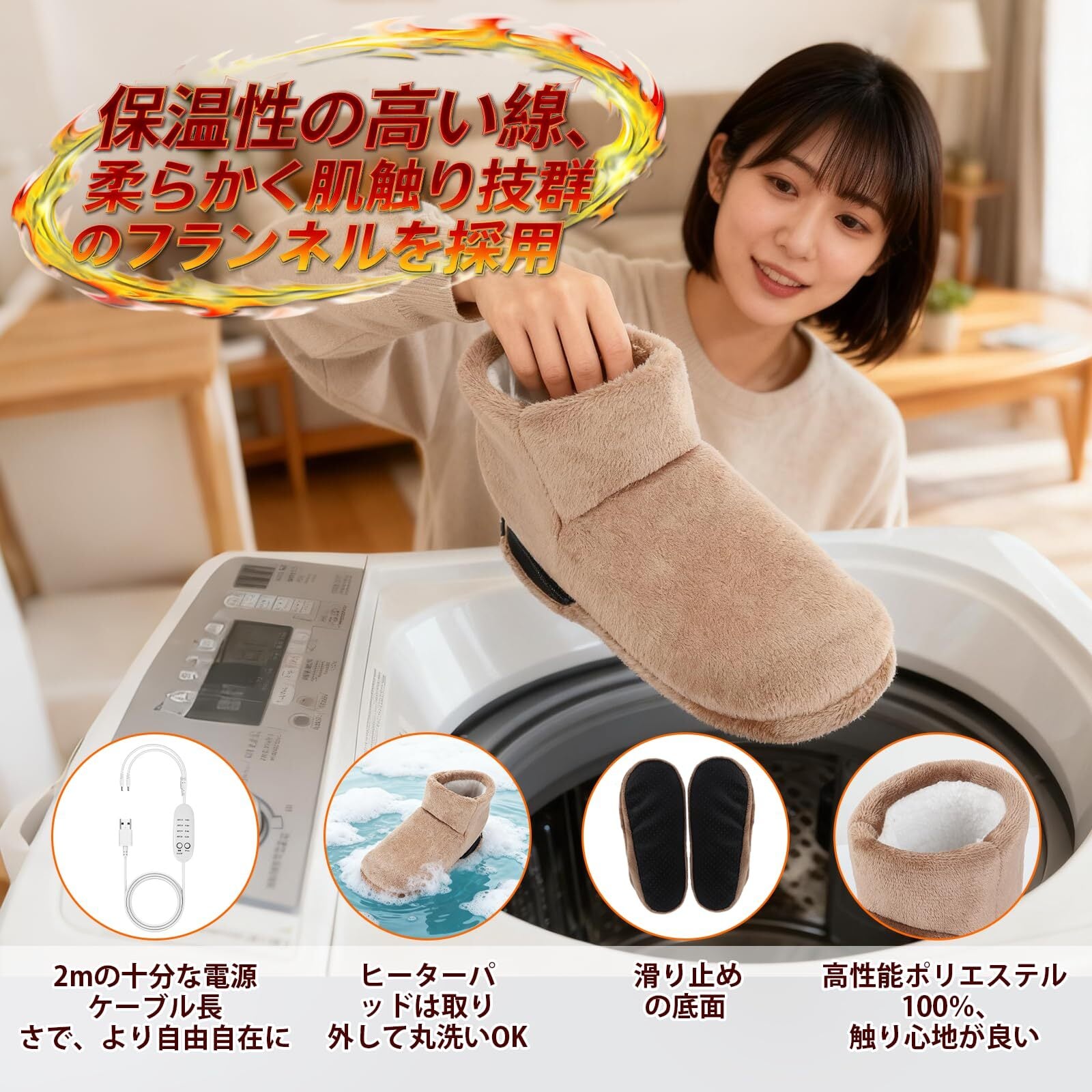 【洗濯可能&安全設計|清潔で安心な毎日】清潔面では、ヒーターパッドを USB 足温器から取り出すことができ、ヒーターパッドを取り外した状態のフットウォーマーは洗濯可能。常に清潔に保てるため、衛生的に使用できます。底面には滑り止め加工が施されており、使用中の滑りを防止しています。サイズは約 28×13cm、高さ 25cm のフリーサイズで、足サイズ 23cm から 26.5cm まで対応しています。デザインはシンプルでオシャレかつスタイリッシュで、男女を問わず使用可能。オフィスや自宅などどの場所に置いても違和感がありません。また、ロング丈モデルルームシューズにはファスナーが設置されており、着脱が非常に容易です。集中作業中、自習時間、DIY 作業、リビングでの読書時など、あらゆる室内シーンで足元をポカポカと温かく保てる実用的なアイテムとなっています。
