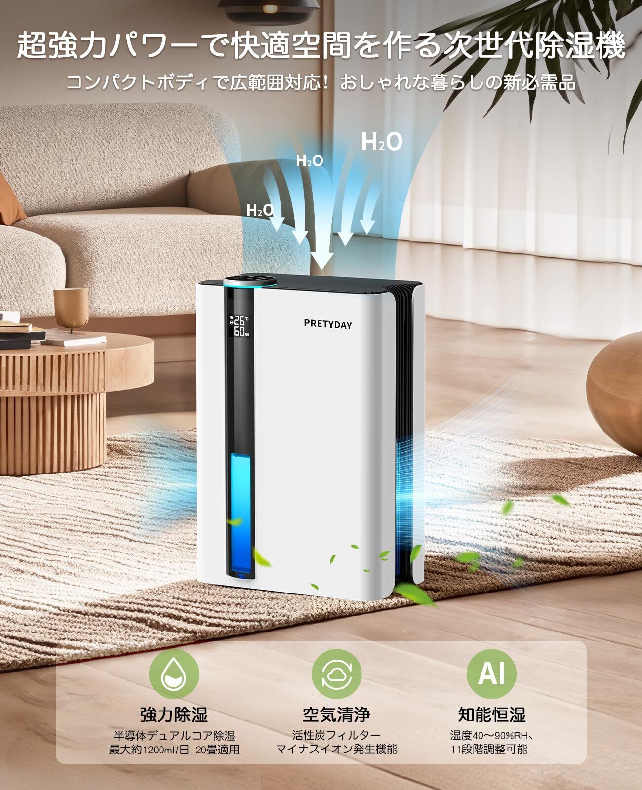 特徴 ①強力除湿 ②恒湿モード ③空気清浄・マイナスイオン④60W省エネ ⑤2800ML大容量水タンク ⑥小型省スペース ⑦七色ライト付
