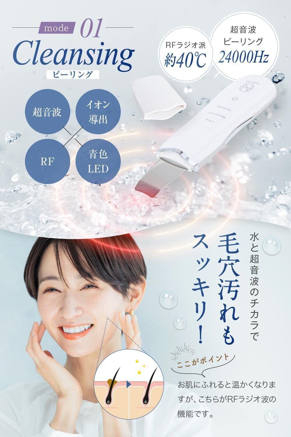 水と超音波の振動により毛穴や古い角質にアプローチ。超音波のチカラで毛穴や角栓の汚れをケアしてお肌を綺麗に整えます。またナノアウォーターピーリングは、RFラジオ派で肌を温めながら、ウォーターピーリングを使うことができるので毛穴汚れをしっかり洗浄。