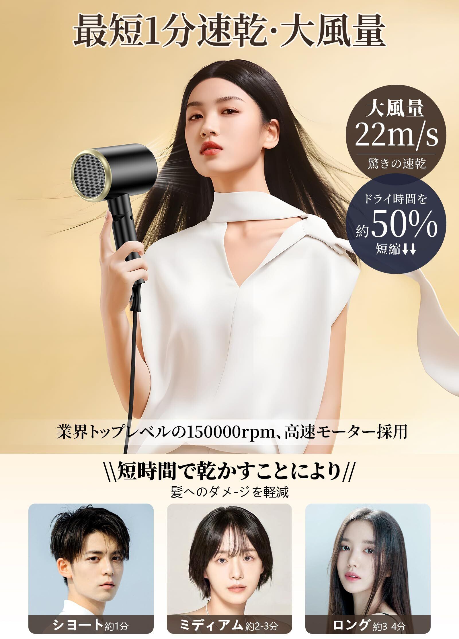 【髪質改善・マイナスイオン】あなたの髪を一日中サラサラで美しく保つ秘密が、このヘアドライヤーには内蔵されています。ヘアドライヤーは取得済みの高濃度ネガティブイオン技術を駆使し、毎回の使用で2000万個ものネガティブイオンを髪に送り込みます。これらのイオンは、髪に水分を閉じ込め、静電気を抑制し、髪の乾燥と切れ毛を防ぎます。長く使うと、髪をつややかにするだけでなく、髪の光沢感と柔らか感を向上させます。「早くて楽に、そして美しく髪を乾かしたい」というニーズを叶えたドライヤーです!