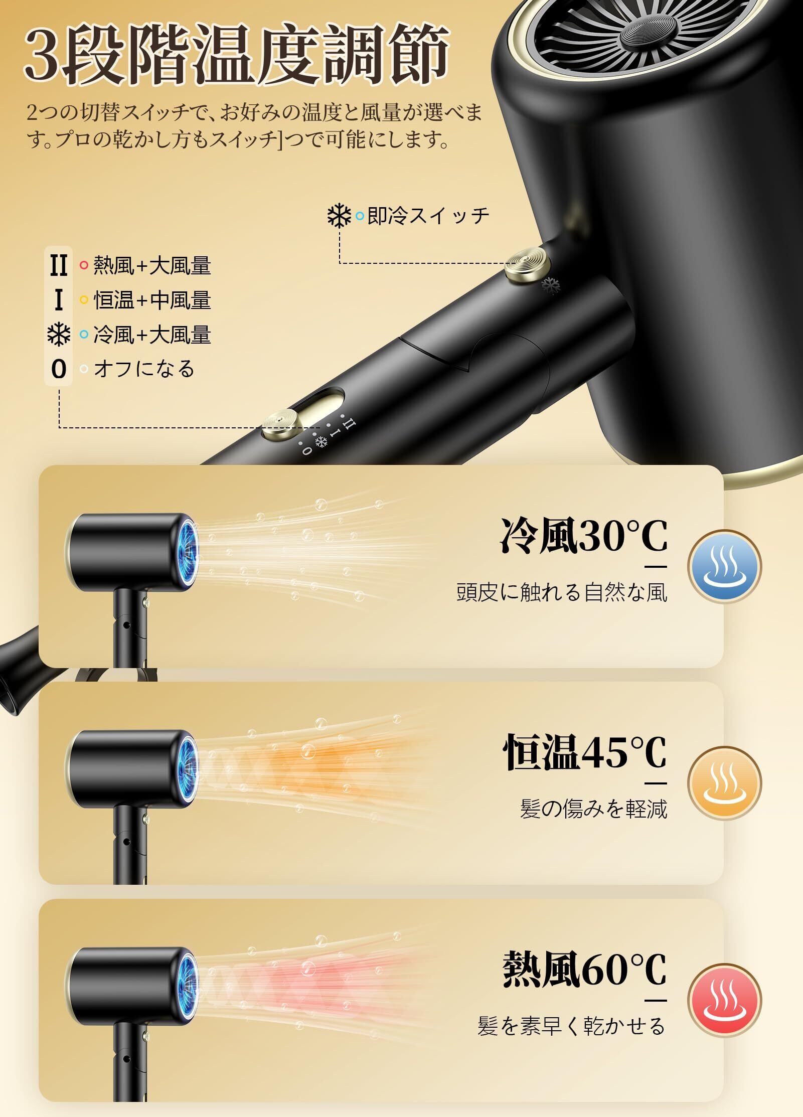 ドライヤー 1400W 大風量速乾 高濃度マイナスイオン 高效動力 折り畳み式超軽量設計 3段階温度調節 冷風/熱風 低騒音 過熱保護機能 便捷持ち運び 恒温ヘアケア 髪質改善 静電気抑制 抜け毛改善 美容師監修 家庭用 旅行用 サロン用 ノズル付き 収納ポーチ付き 日本語説明書付き PSE認証済み HairDryer-CFJ06-2025d11
