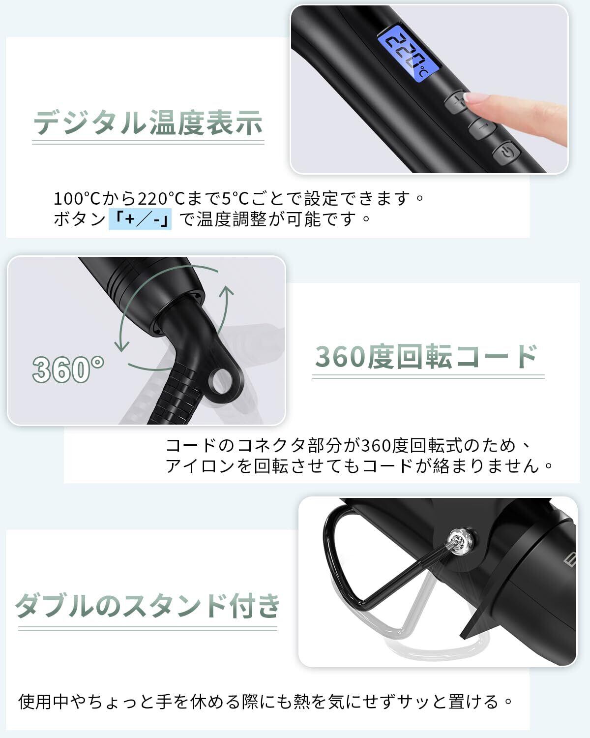 【デジタル温度表示&360度回転式&長めコード】カールアイロンにデジタル温度表示付き、現在の温度を素早く把握することができる。「+/-」ボタンを長押しで希望の温度を素早く設定でき、短押しで温度を小刻みに調整、最低温度100℃から最高温度220℃まで設定可能。360度回転式で使用中のコードのもつれや絡まりを防ぎます。さらに、約2m長めの電源コード、場所を問わずにお使いいただけます。