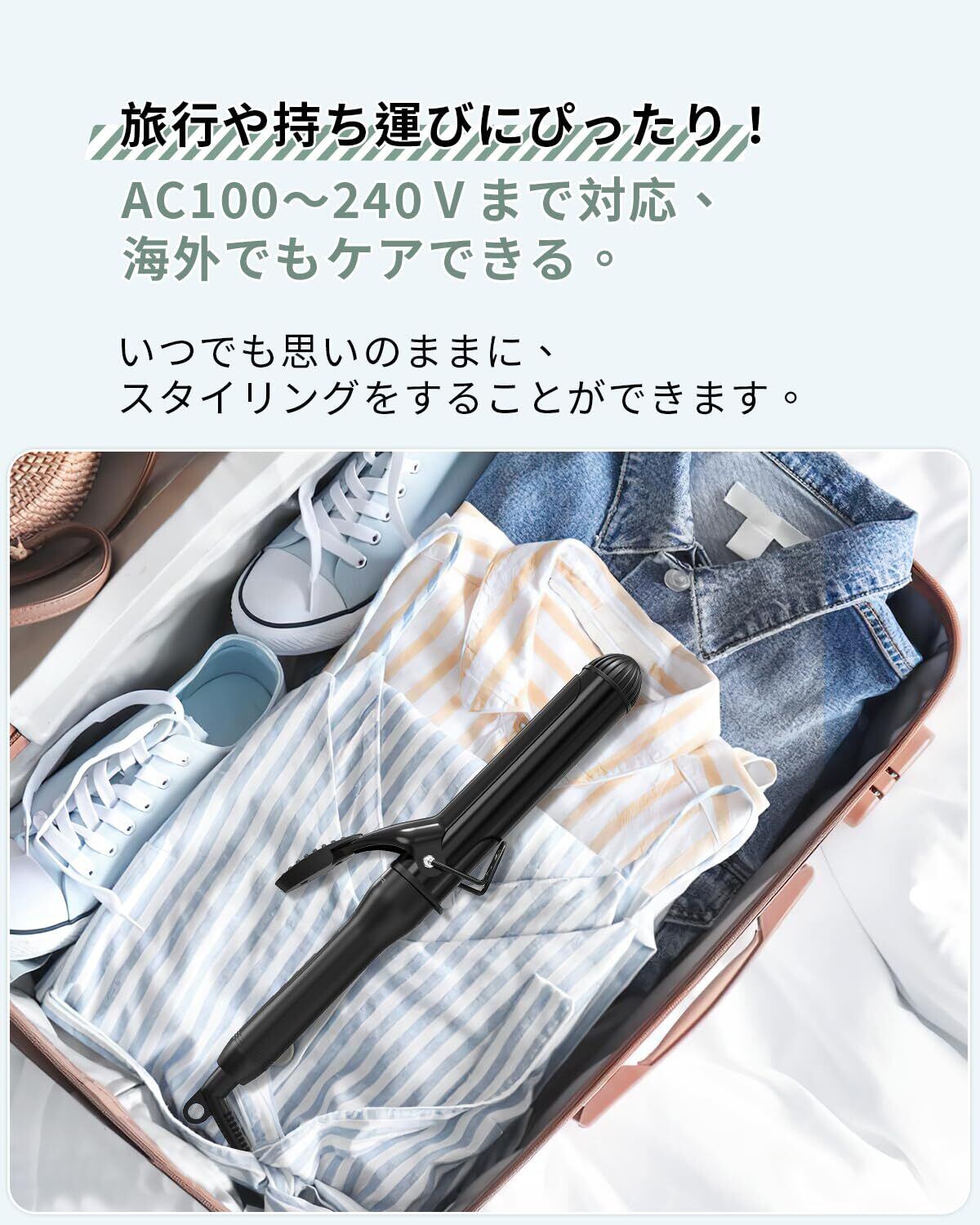 【1時間自動電源オフ&海外対応】カールアイロンの電源をONにしてから、1時間後自動的に電源がOFFになります、万が一の消し忘れにも安心です。ヘアアイロンはAC100-240Vの電圧対応するから、海外でもケアできます。海外で使用する場合、変圧器は不要です。旅行や持ち運びにぴったり!いつでも思いのままに、スタイリングをすることができます。※変換プラグはご用意ください。