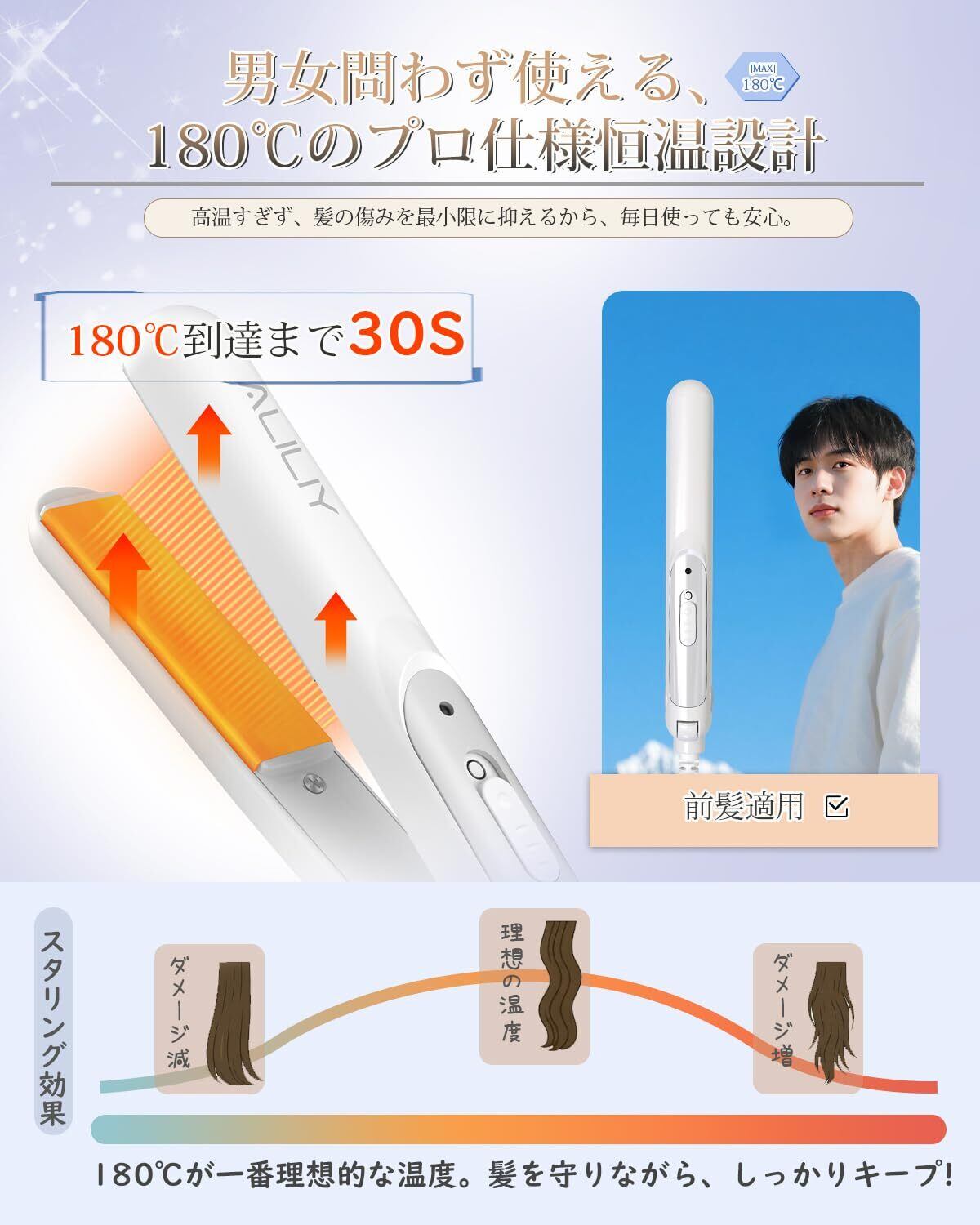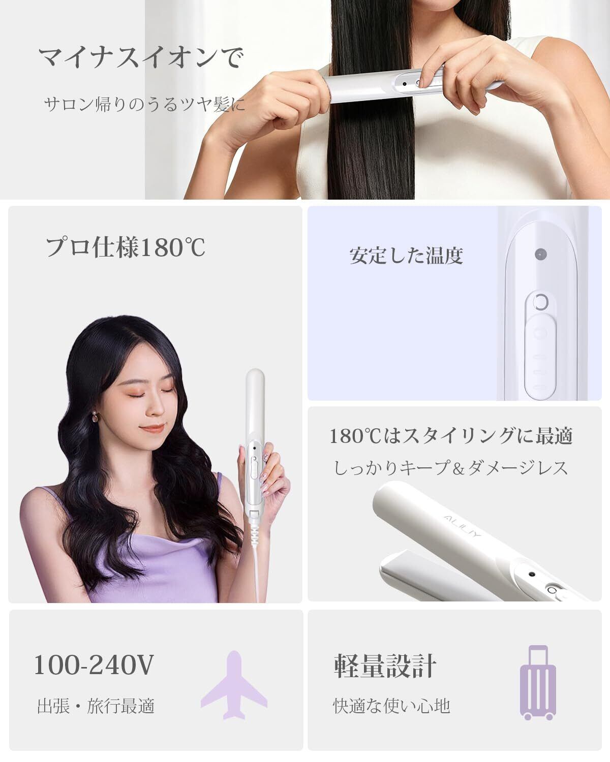 【プロ仕様180℃&海外旅行にもOK✈️】最大180℃まで加熱できるプロ仕様設計。髪に優しく、しっかりクセを伸ばしながらツヤをキープ。ストレートもふんわりカールも、思い通りのスタイルが自由自在。電源を入れてからわずか約30秒で使用可能に!忙しい朝でもすぐにスタイリング完了!さらに100〜240Vの海外対応で、旅行や出張先でも大活躍。※ご使用の国によっては変換プラグが必要です。