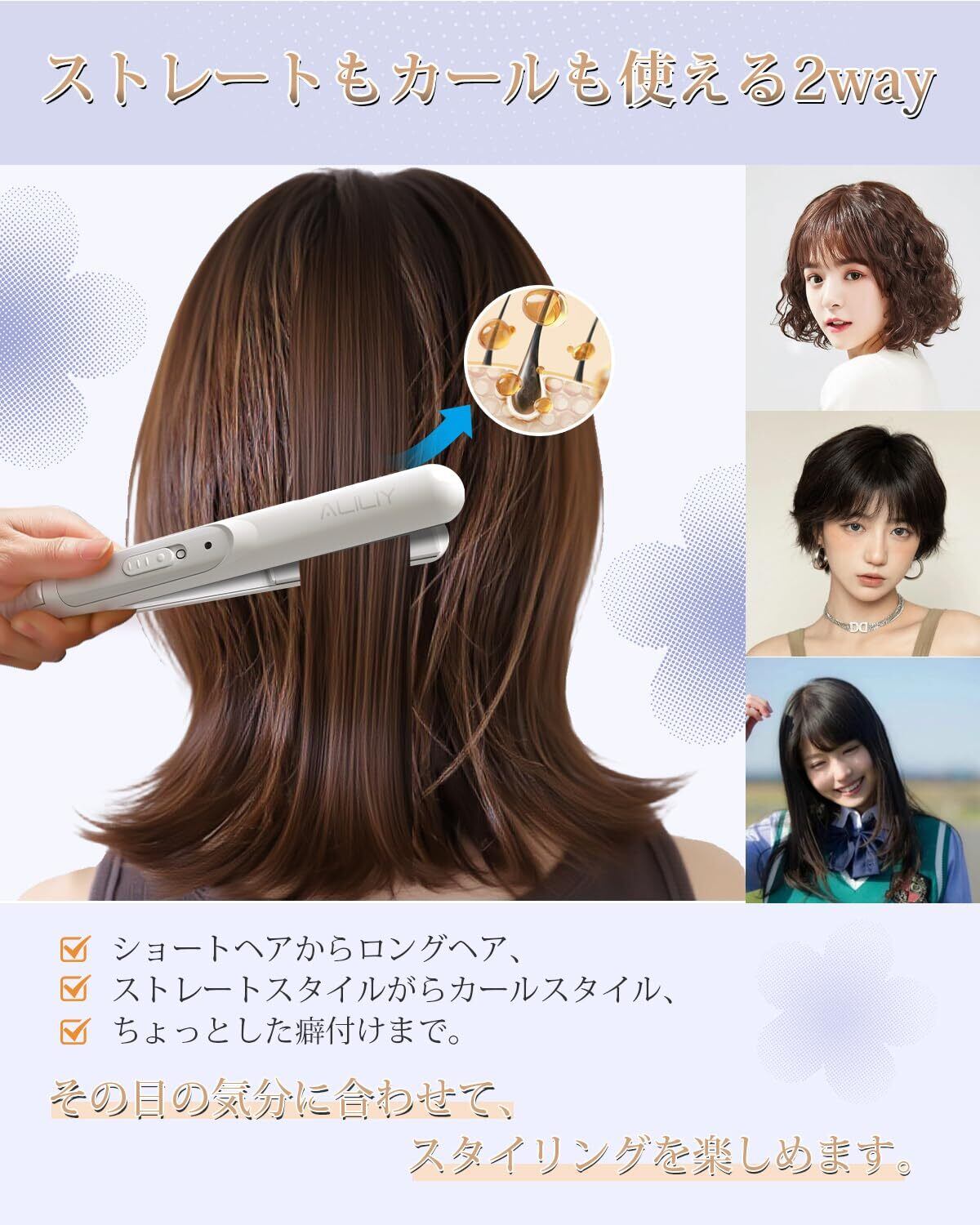【男女兼用✨ストレートもカールも自由自在】電源を入れるだけで、すぐにサロン級のスタイリングが完成!ストレートのツヤ感も、カールの華やかさも思い通りに仕上がる2wayヘアアイロン。ショートからロングまで対応し、ツヤのあるストレートも、ふんわりカールも自由にアレンジできます。寝ぐせ直しも、イメチェンも、全部おまかせ。毎日が新しい自分に出会える――「今日の可愛い」は、自分でつくる時代