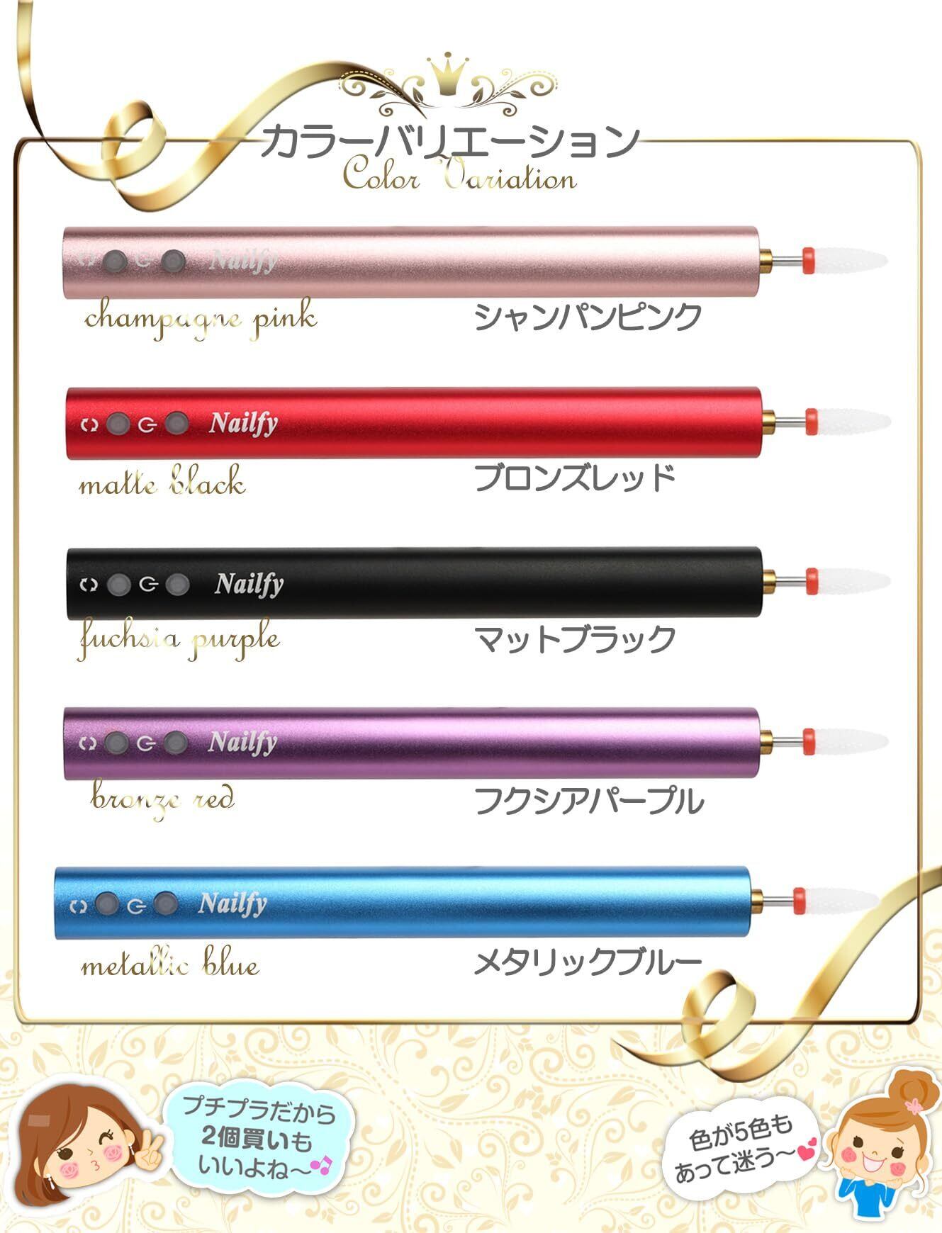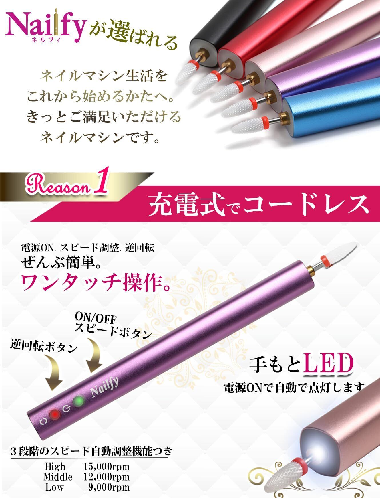 今までなかった!充電式コードレス、スタイリッシュでかわいい持っていて楽しくなるすごく便利なネイルマシンです。 すぐれた機能性とデザイン性を兼ね備え、手軽で美しい手元を演出。多彩なネイルアートに必要な機能が搭載され、自宅でのネイルケアからサロンユースまで、幅広い用途で美しい仕上がりを実現します。