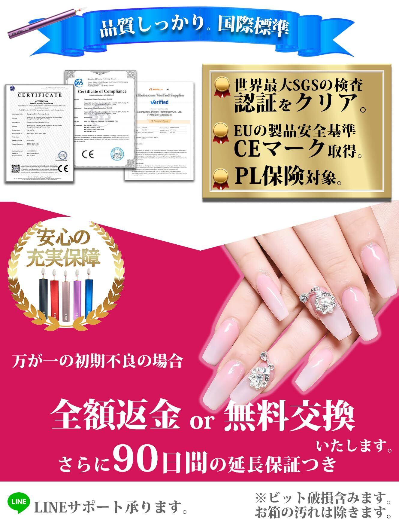 【豊富なネイルビット】セラミックビットを標準装備!その他ネイルアートに必要なあらゆる形状に対応したビットセットは豪華11点。特にセラミックビットは見た目もかわいいし、サンディングよりも衛生的で長持ち、ネイルオフには一番使えます。(もちろん水洗いできて衛生的。)ビットは直径Φ2.3mmの市販ビットに対応しています。