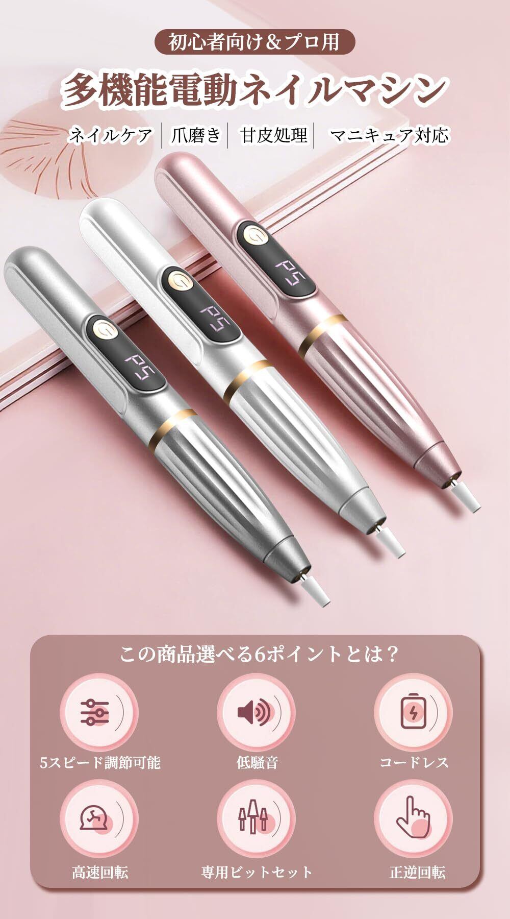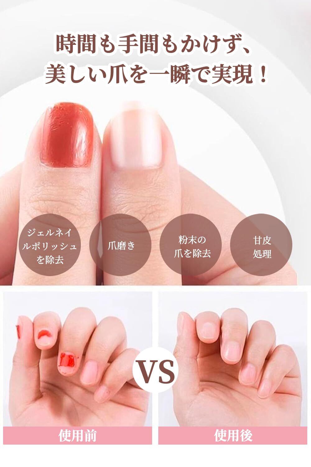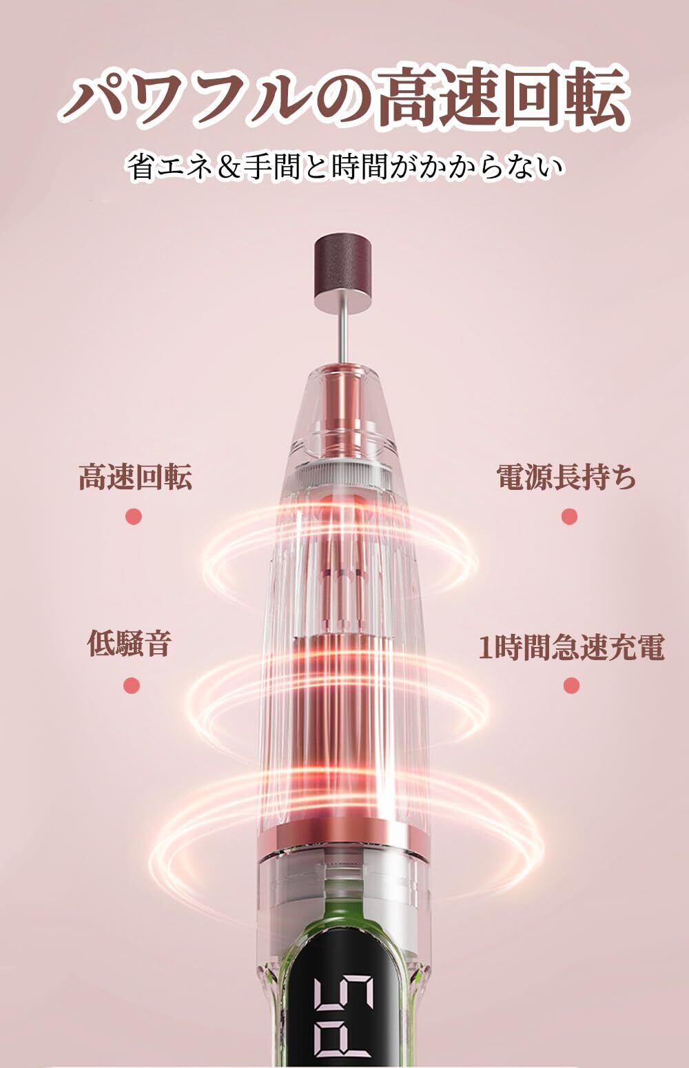 【高速回転&低騒音】パワフルの高速回転により、アクリルネイル形作り、カルス除去、ジエルネイルリッシュを除去、爪磨き、甘皮除去様々な状態に対応し、素早く滑らかに研磨できるため、時間と労力を大幅に節約できます。また、動作中の騒音は極めて低く、従来のマニキュアツールの耳障りな音とはおさらば、静かで快適な環境でネイルケアを完了できます。