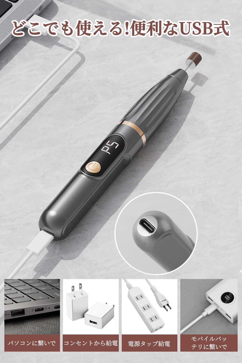 【Type-C充電&大容量バッテリー】モバイルバッテリー、パソコン充電や車載USBソケットなど、USBポートから給電する事が可能な為、出先で充電コンセントが無い場合でも安心してお使い頂けます!また大容量バッテリーにより、一度フル充電では2時間使用可能です。複数回のネイルケアのニーズに対応します。外出時にバッテリー切れの心配もありません。