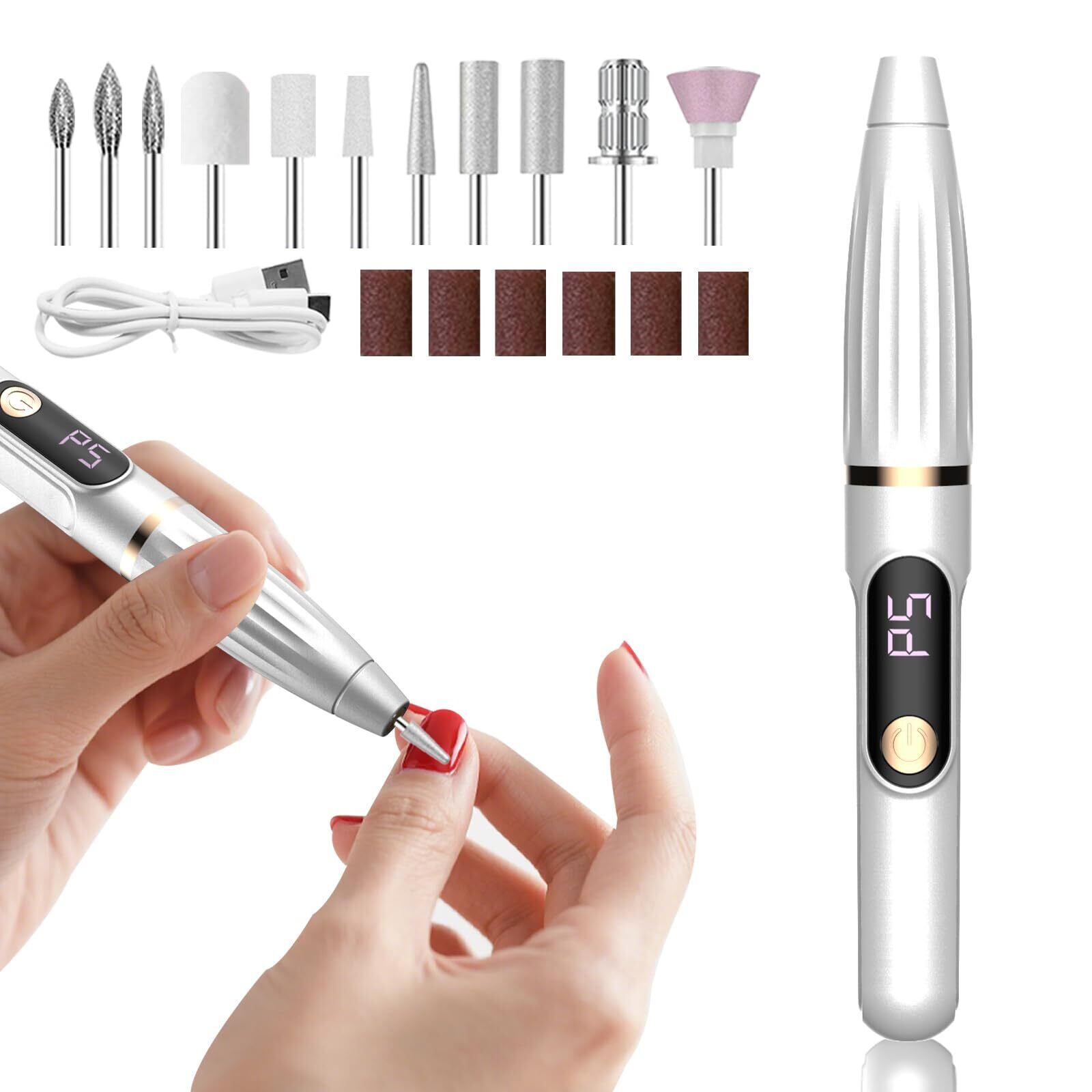 ネイルマシン 電動ネイルマシン LEDデジタル表示搭載 高速回転 スピード調節可能 コードレス Type-c充電式 ネイルドリル 専用ビット11個セット マニキュア対応 ネイルケア 爪磨き 甘皮処理 正逆回転 低騒音 セルフオフ コンパクト 自宅用 サロン用 プロ用 初心者 ネイルマシーン ジェルネイル(ホワイト)