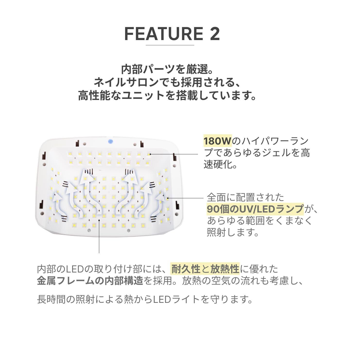 【90個のランプ搭載】90個のLEDとUVの二重光源で幅広いジェルに対応しています。(波長365nm+405nm)