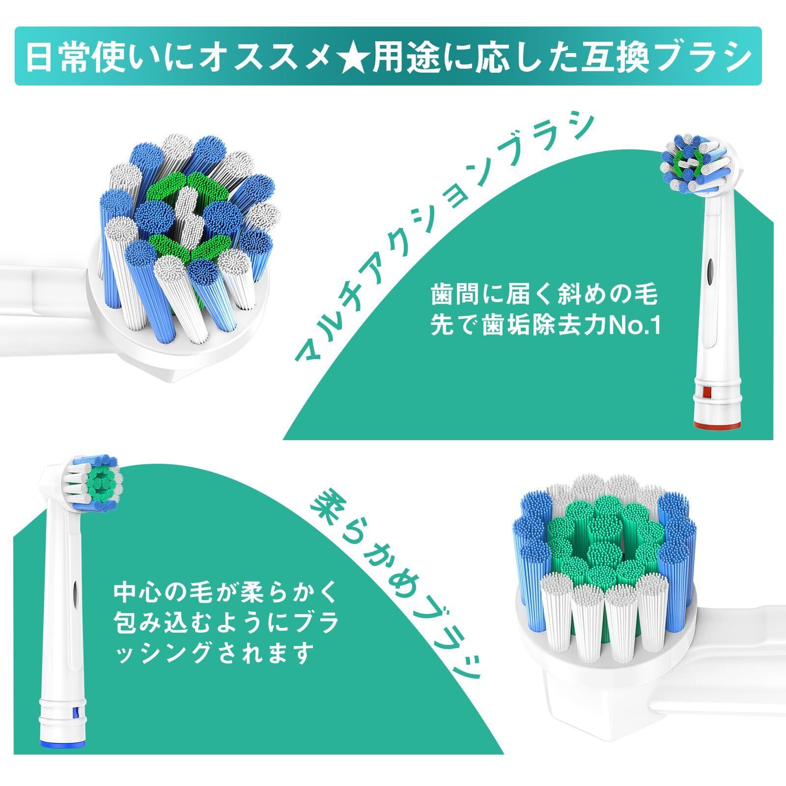 【歯茎の健康を守る】①米国DuPont素材使用:0.12mmと0.15mmの丸みを帯びた毛先が歯肉や歯面に優しく、効果的に洗浄します。②高精度ラウンド加工:毛先1本1本が歯面や歯肉に優しくフィットし、安心して使用できます。③衛生カバー付属:ブラウン電動歯ブラシ対応の替えブラシには衛生カバーが付属し、ブラシ毛の形状を保ち、ほこりや細菌の侵入を防ぎます。④優れた互換性とコストパフォーマンス:オーラルB用の替えブラシは、正規品に近いブラシ形状で優れた互換性を持ち、年間数万円の節約が可能です。気軽に交換できます。