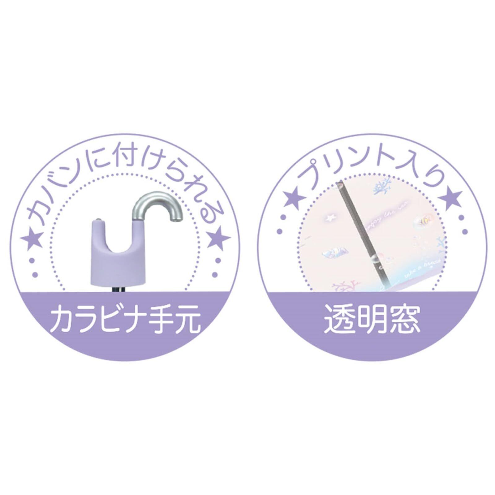 雨の日も楽しくなる かわいいプリント柄の子供用折りたたみ傘です。通園 通学 お出かけ用 急な雨の置き傘としてもおすすめです。 ゆめかわな海の世界が可愛らしい雨の日もハッピー1面は透明窓で視界は良好です。 同じプリントの収納袋付き。軽量で持ち運びもらくらく、ランドセルにも入ります。お子様でも簡単に開閉できる手開き式です。指をはさみにくい安全ろくろ付きです。 カラビナ使用で手元部分をひねると開きます。ランドセルやリュックに掛けたできます。手元がストレートなのでカバンの中に収納しやすいです。 【生産国】 中国 【素材】 ポリエステル100% 【親骨】 グラスファイバー 【重量】 約220g【親骨の長さ】約50cm 【直径】役90cm 【全長】 約59cm 【収納時】 長さ約26cm 幅約8cm