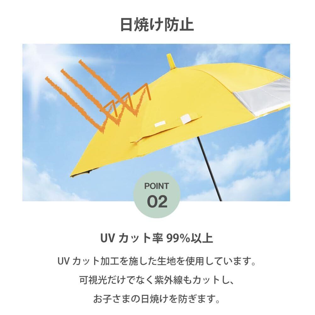 【子供の安全を考えた仕様】傘をさした際の正面の生地部分に、裾から12cmほどまで透明窓がついており、前が見やすくなっています。また、透明窓の反対側には裾に反射テープがついており、暗い場所でライトなどの光が当たると光るので、夜道でも安心です。骨には軽くて丈夫なグラスファイバーを使用しています。