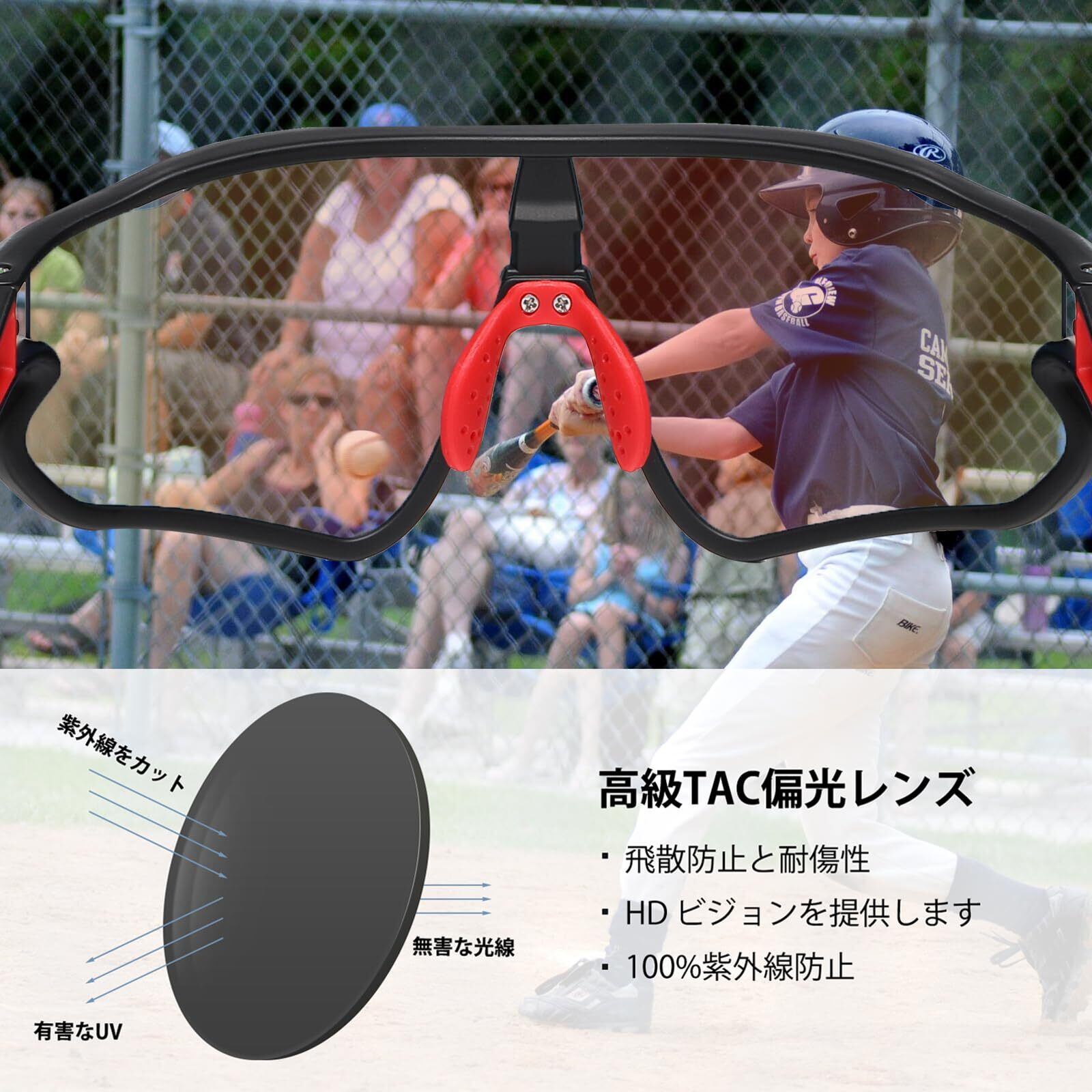 100%UVカットレンズを使用しており、紫外線から子供の目を保護します。長時間の屋外活動や野球の試合中でも、眩しさや光の反射を軽減します。