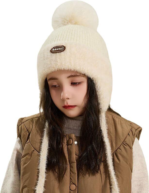 [LeafIn] 子ども ニット帽 キッズ 男の子 キッズ ニット 耳あて 帽子 ポンポン 紐付き ニットキャップ スノボー スキー 子供 防寒帽子 冬 こども ニット帽子 4-10歳向け 49-54cm 2216