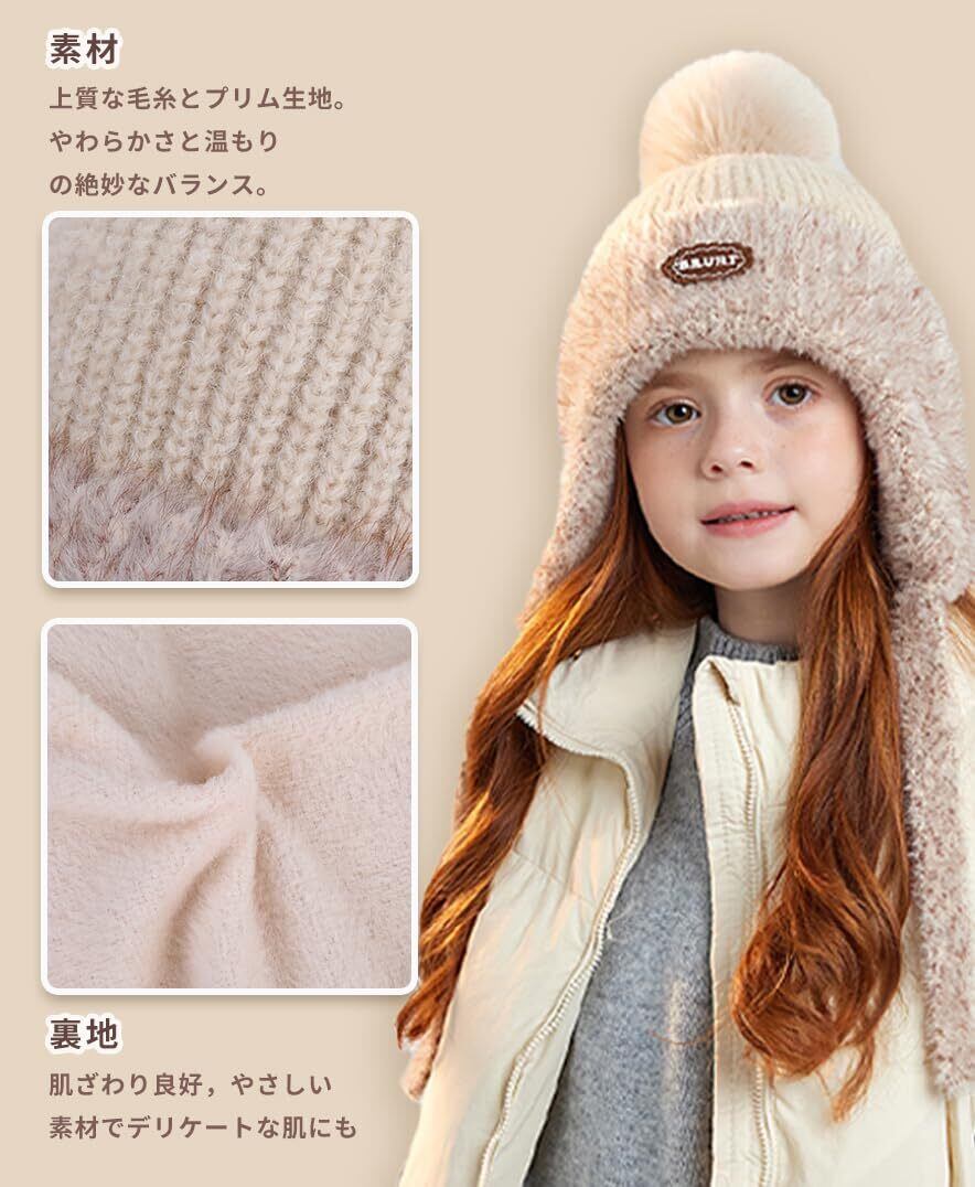 【数量限定】[LeafIn] 子ども ニット帽 キッズ 男の子 キッズ ニット 耳あて 帽子 ポンポン 紐付き ニットキャップ スノボー スキー 子供 防寒帽子 冬 こども ニット帽子 4-10歳向け 49-54cm 2216