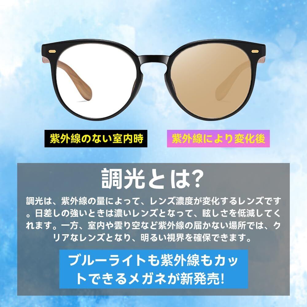 【調光変色・1本2役】室内ではブルーライトカットメガネとしてご利用いただけるので、目に有害なブルーライトをカットできます。屋外でUV、まぶしさを抑えてくれます、メガネとサングラスを掛け替える手間が無く、一つで二役の便利な眼鏡です。
