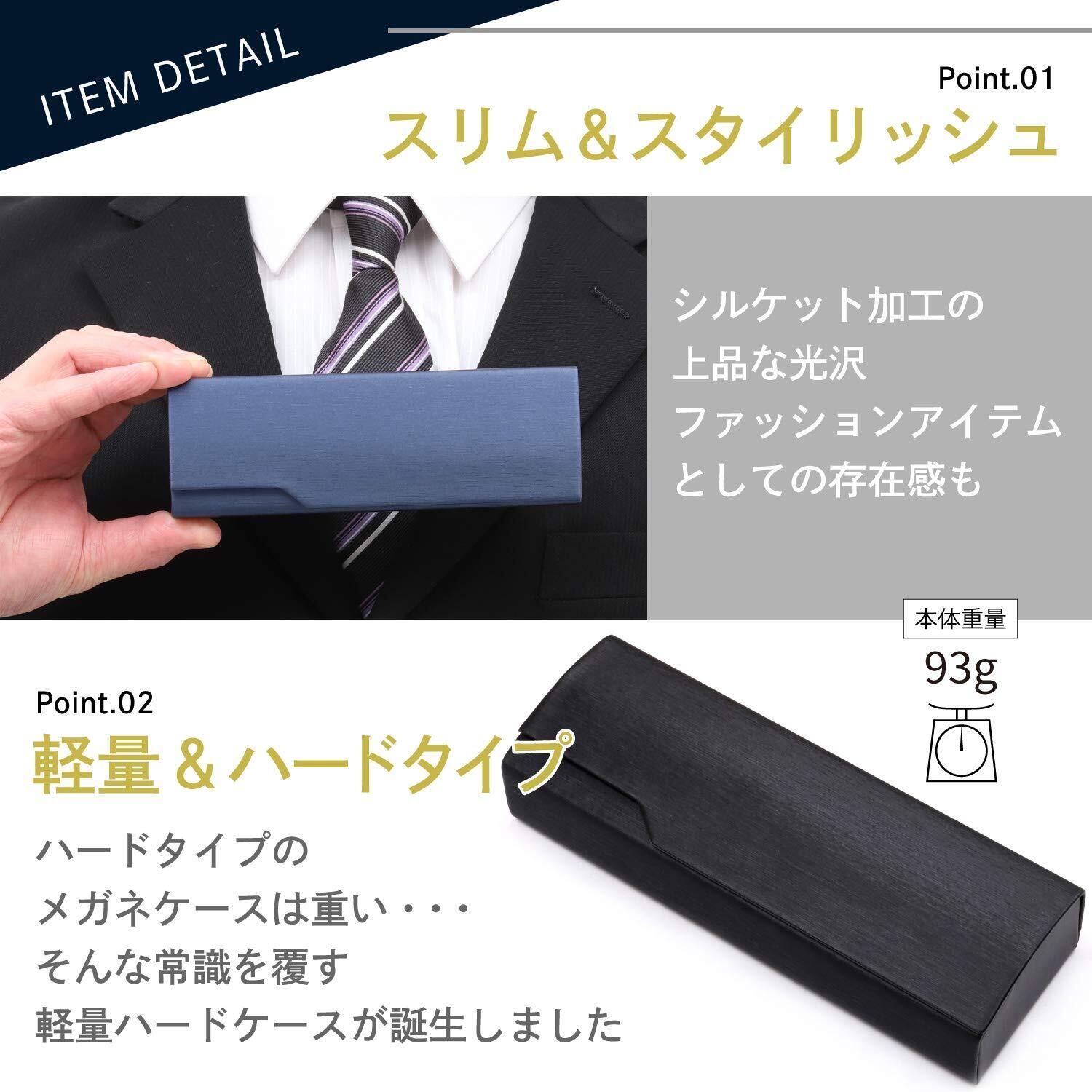 【上質感あふれるシルケット加工】 表面に採用された上質な風合いの生地。PUをまるでシルクのような光沢感ある素材に変える、シルケット加工が施されています。お部屋やオフィス、書斎など、どこに置いても様になる質感が魅力です。つるりとしていて、ずっと触っていたくなる手触り、内面には厳選したオリジナルのベロア調のブラック生地を使用。メガネへの当たりがやわらかくキズを防ぎます。また若干のクッション性も備えているので、落下などの際もメガネをしっかり保護してくれます。
