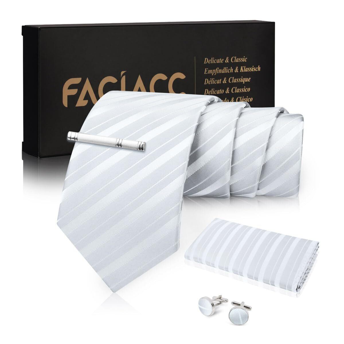 【エレガントなデザイン】白ネクタイ本体サイズ: 3.4"× 59"(8.5cm × 150cm)、ハンカチサイズ:12"x 12"(31cm x 31cm)、このFACIACCクラシックなストライプ柄のネクタイはレトロなスタイルとファッションスタイルの完璧な融合です。年齢を問わず、通年お使いいただけます;ご自用はもちろん、絶妙なギフトボックスのパッケージ、新郎と友人とお父さんへの大切な男性への贈り物にも人気のプレゼントです、父の日、クリスマス、バレンタインデー、感謝祭、記念日、誕生日などのプレゼントに最適です。
