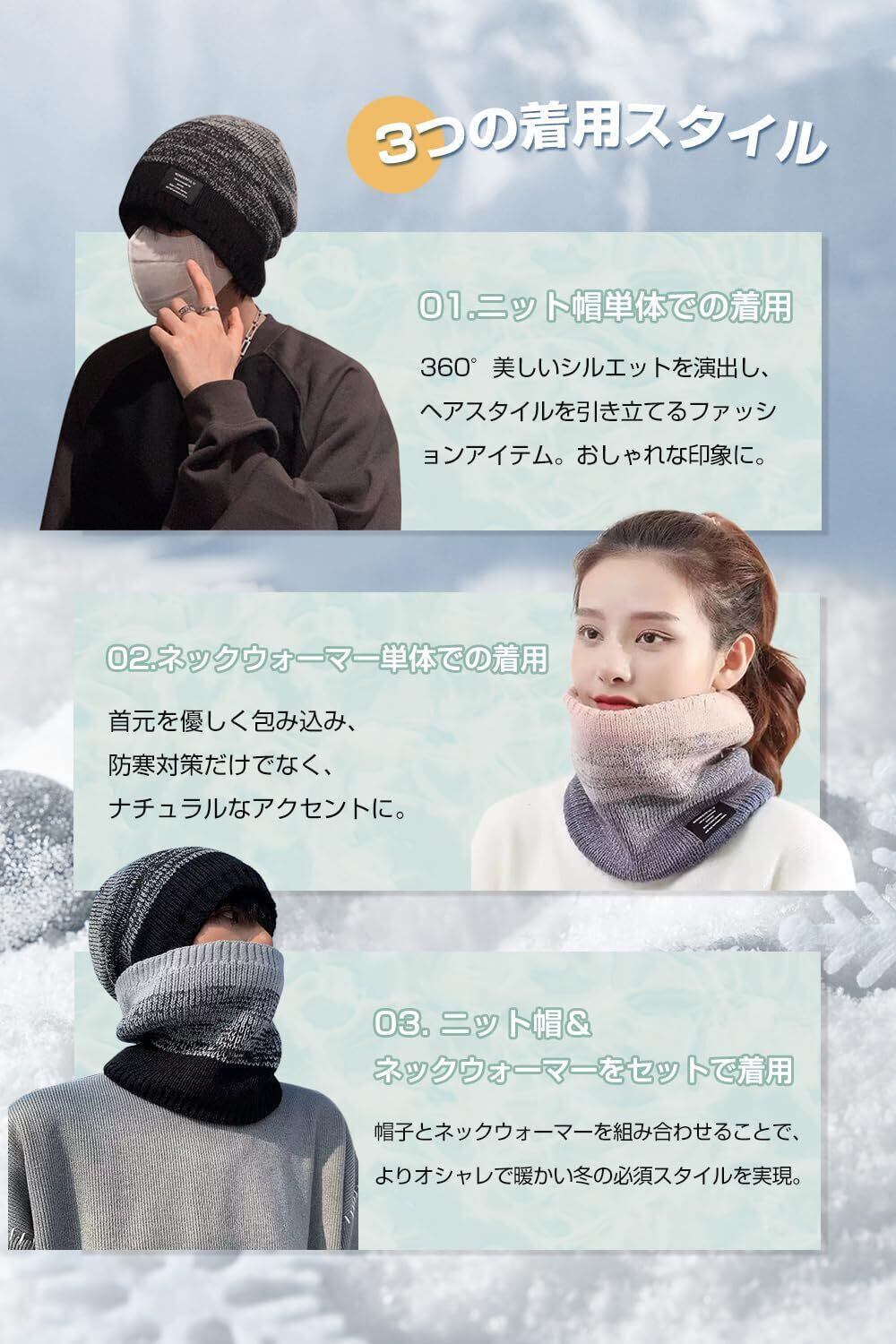 【寒さを徹底ブロック!防寒2点セット】冬の厳しい寒さから頭と首元をしっかりガードするために設計された、ニット帽とネックウォーマーの2点セットです。表面の高密度ニット生地と内側のふわふわボア裏起毛の二重構造が冷たい外気を遮断し、抜群の防寒・防風効果を発揮します。