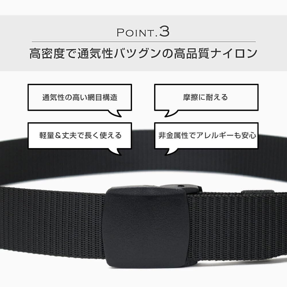 【高品質ナイロンベルト】ベルト帯部分は耐久性が高いナイロン素材を採用。ハードな使用でも問題ございません。 穴なし無段階で調整可能な機能性を装備、好きなところで長さ調整できます。どんな体型の方も気軽にご着用いただけます。