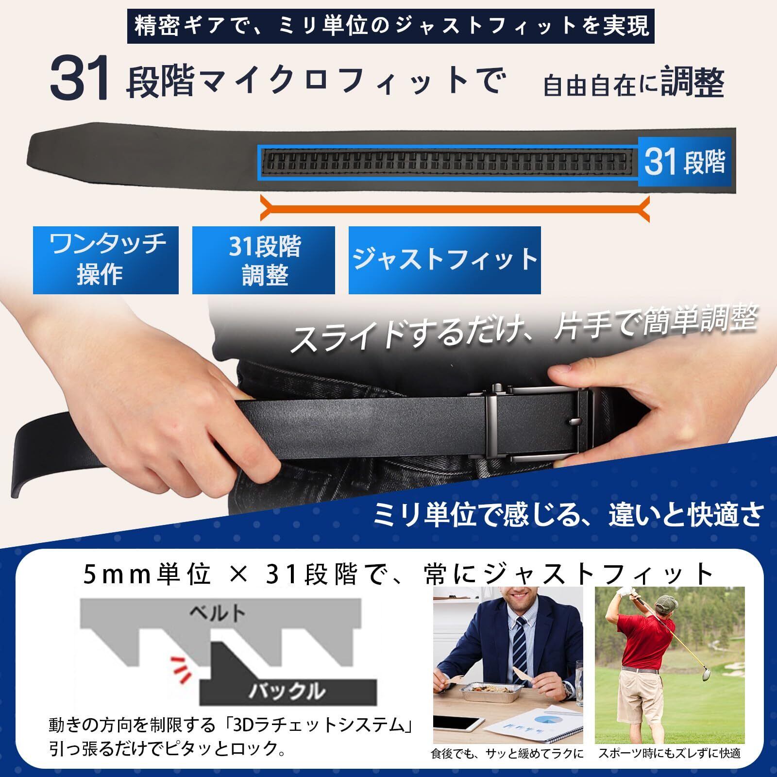 【ワンタッチ調整で、どんな瞬間もスマートに】忙しい朝、外出中、食後など、着脱やサイズ調整のたびに煩わしさを感じていませんか? このベルトは、穴のないラチェット式を採用。ベルトをスライドさせるだけで、片手でも微調整が可能。人前でも気づかれずにスムーズに緩められ、着け心地も常に快適です。