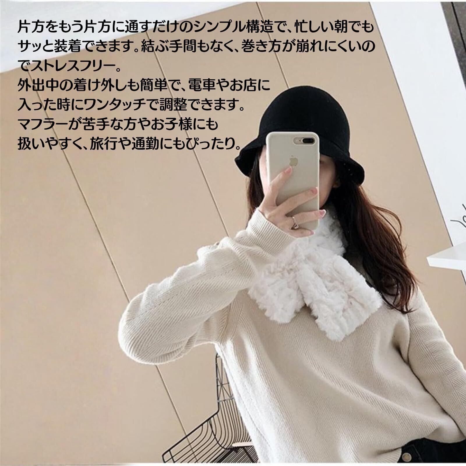 【思わず触れたくなる、ふわふわエコファーの極上ぬくもり】見た目から伝わるふわふわ感をそのままに、肌に触れると驚くほど柔らかく心地よいエコファー素材を採用。首元に優しく沿うため、チクチク感がなく長時間付けていても快適です。冷たい風をしっかり遮り、ほんのりとした体温を包み込んでキープしてくれるので、真冬の外出も安心。ふんわりとした質感が顔周りの印象を明るく見せ、女性らしさを引き立てる“あったか可愛い”冬の必需品です。