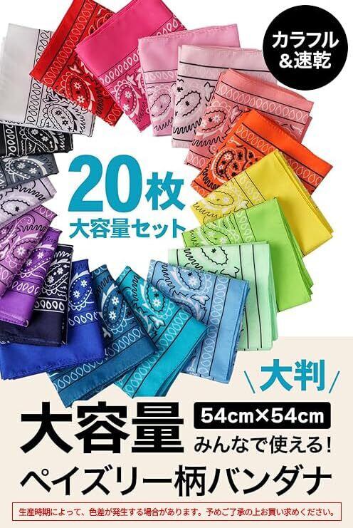 【在庫処分】[Double Peace] バンダナ 大判 54×54cm 大容量 20枚セット 「みんなで使える!カラフル&速乾 ペイズリー柄」