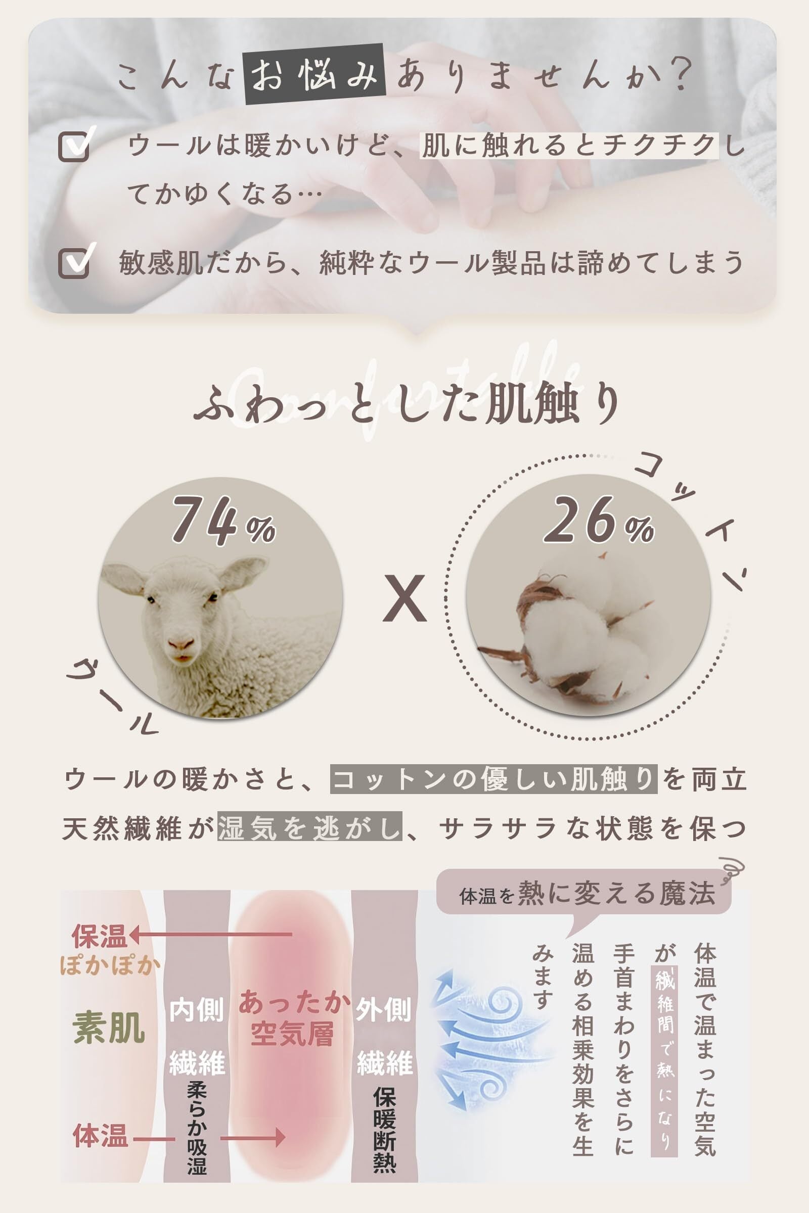 【暖かさ&ふんわり触感】 暖かさの秘密はウール74%の黄金比!本社のハンドウォーマーは、コットン26%を混紡することで、「ウール特有のチクチク感」を解消し、ふんわり軽やかな極上の肌触りを実現しました