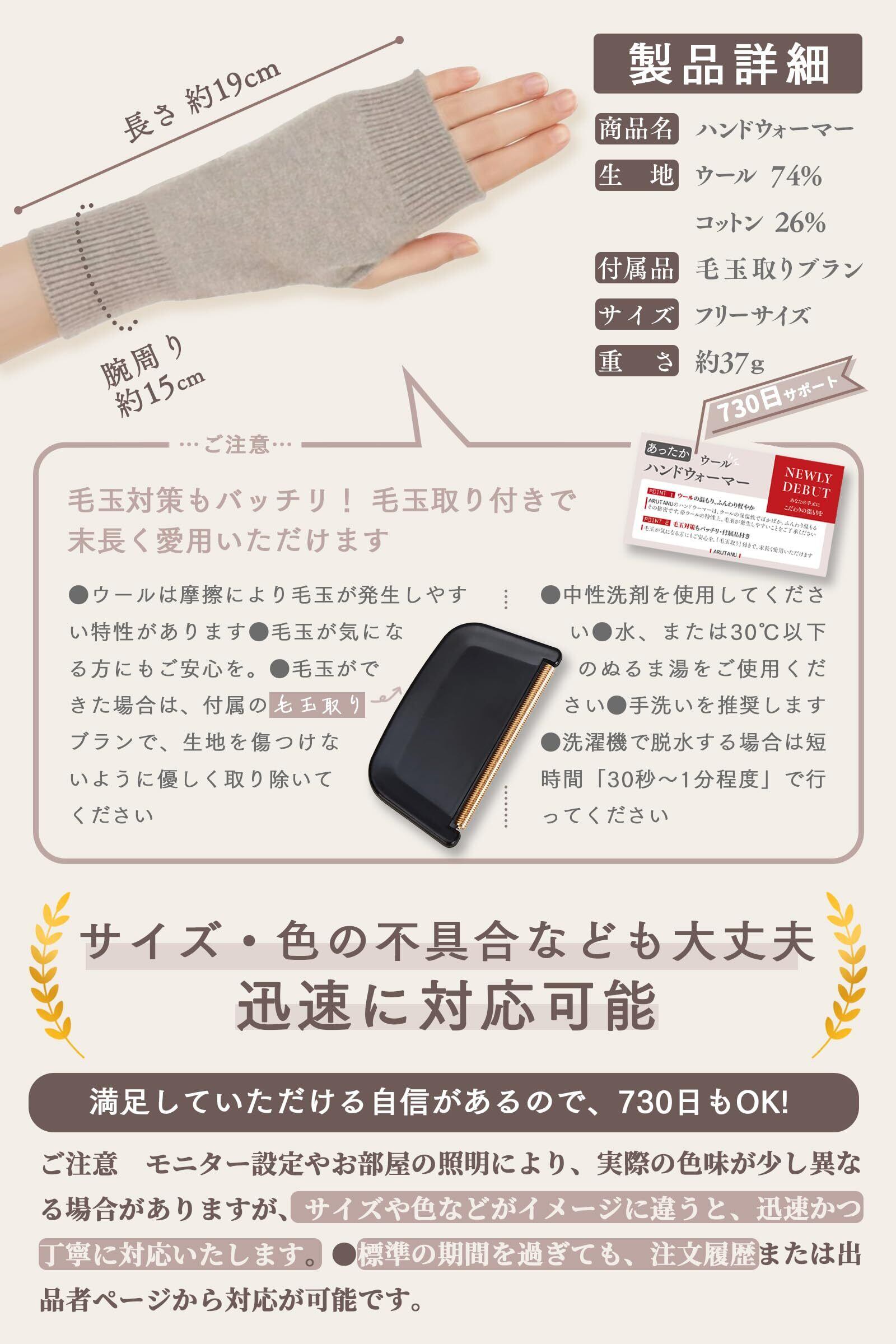 暖かさの秘密はウール74%の黄金比!本社のハンドウォーマーは、綿26%を混紡することで、「ウール特有のチクチク感」を解消し、ふんわり軽やかな極上の肌触りを実現しました。普通の手首ウォーマーと違い指先が出るデザインなので、家事、キーボードのタイピング、スマホ操作、書き物など、指の繊細な動きを妨げません。冷えやすい手首を優しく温めながら、冷たいデスクやPCとの接触を遮断し、冬のオフィス作業や在宅ワークに最適な冷え対策アイテムです。「ウールのリストウォーマーは毛玉が心配…」というお客様もご安心ください。専用の「毛玉取りブラシ」を同梱していますので、ウールの特性上、毛玉が発生してもすぐにお手入れが可能で、長く、大切にご愛用いただくためのメーカーからの心遣いです。また、「使用や洗濯による予期せぬ損傷」「サイズが合わなかった」などのご心配は不要です。製品に同封されているサポートカードをご確認ください。お客様に末永くご愛用いただくための、メーカーとして万全な体制を整えております。重さは約37gと超軽量で、付けていることを忘れるほどの快適さ。Freesizeでメンズ・レディース兼用。豊富なカラーバリエーションをご用意しており、ファッションのアクセントにも。1ペアまたは2ペアのセットオプションをご用意しており、洗い替えにも便利です。