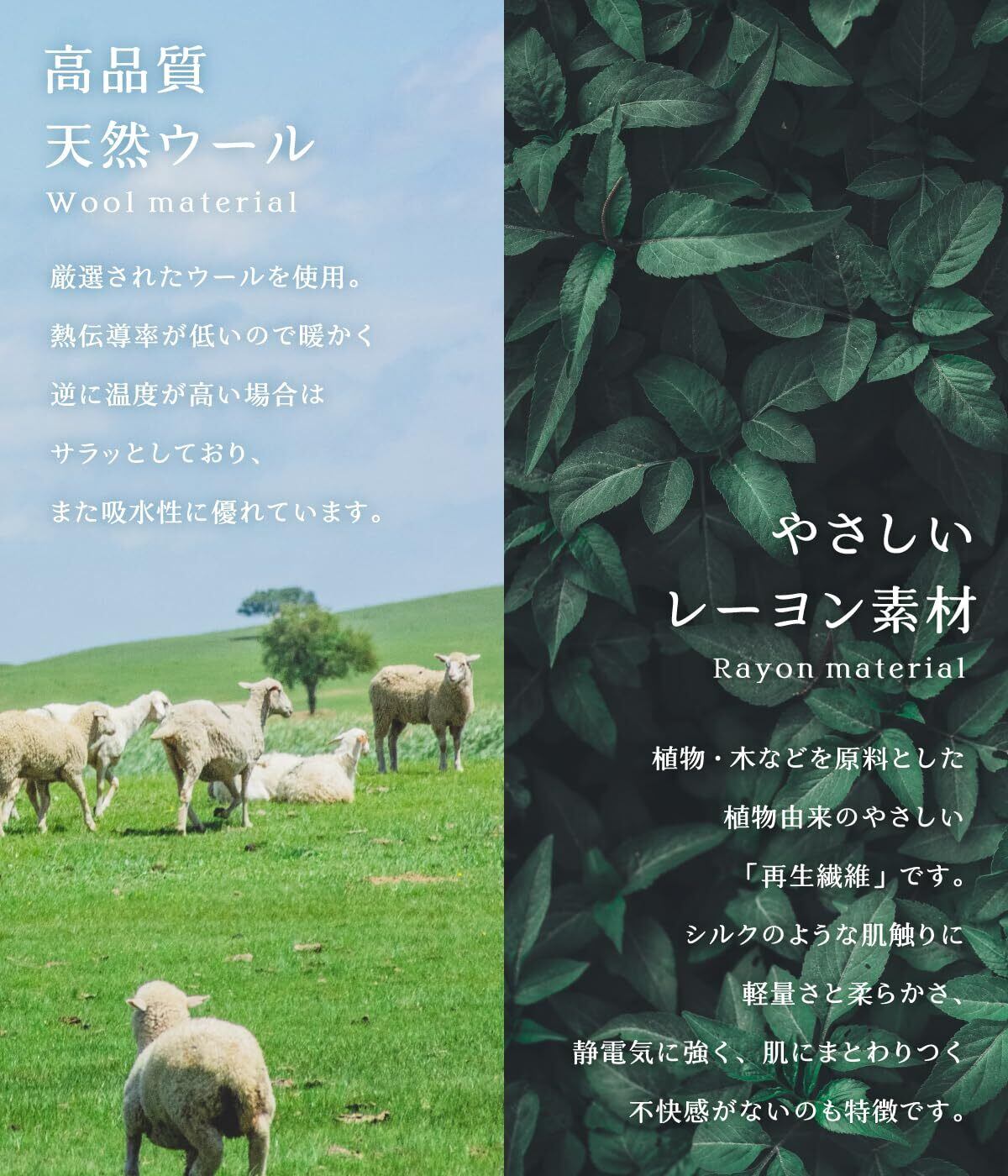 天然ウールとレーヨンを使用した独自繊維で肌にまとわりつく不快感がないので、秋・冬の寒さ対策にはもちろんのこと通年を通して快適にご使用いただけます。