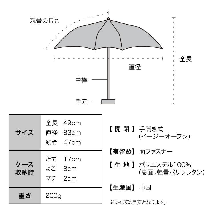 【雨の日も使える日傘(晴雨兼用)】この製品は日傘としてお使いいただくことを主としていますが、はっ水防水加工を施しているため雨傘としてもお使いいただけます。※激しい雨や長時間の雨傘としてのご使用は雨漏りや色落ちの原因となる可能性がございます。またデザインの特性上、完全な防水はっ水加工が難しい場合があり、雨が染み込むことがありますのでご注意ください。