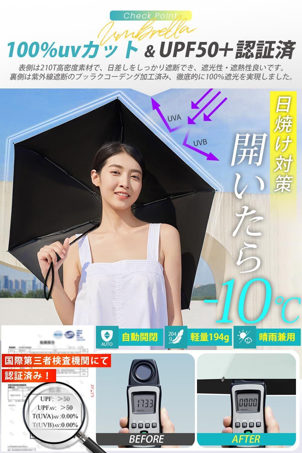 【在庫処分】【194g超軽量・風に強い高強度アルミ製傘骨】 日傘 uvカット 折り畳み 【UPF50+認証済み・ワンタッチ自動開閉・錆が発生しにくい】 折りたたみ傘 遮光遮熱 撥水耐風 紫外線対策 超コンパクト 晴雨兼用 日傘兼用雨傘 傘 レディース メンズ
