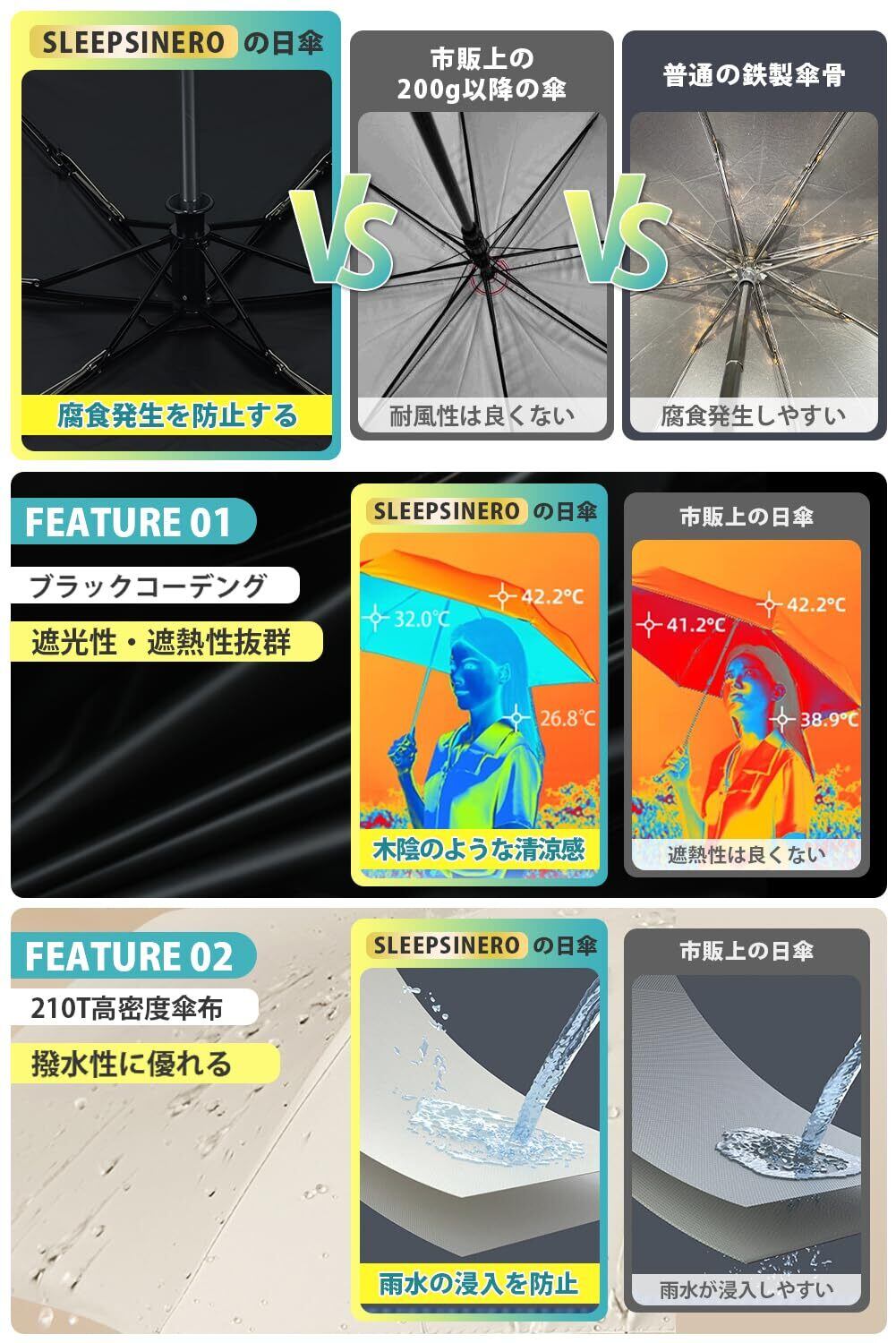 ️【194g超軽量&風に強い高強度アルミ製傘骨】 SLEEPSINEROの194g超軽量折り畳み日傘は「より軽い・より頑丈な日傘」を理念として心を込めて開発されました。鉄製の日傘を200g以降にすると、傘骨はかなり細くなり、風に弱いです。しかし、250g以上にすると重すぎ、長時間の室外活動には不便です。熟慮の末、SLEEPSINEROの折り畳み日傘は比重が軽い、強度が高いアルミ製6本傘骨を採用しました。その上、軽くて防風性良い傘布を精選しました。時間をかけて研究・製造され、軽量性・遮光性・耐風性を追求した日傘です。
