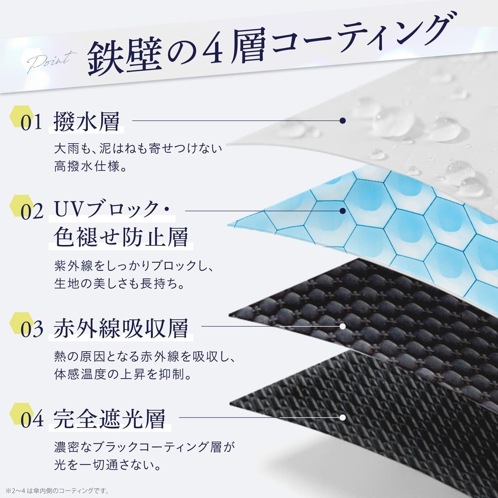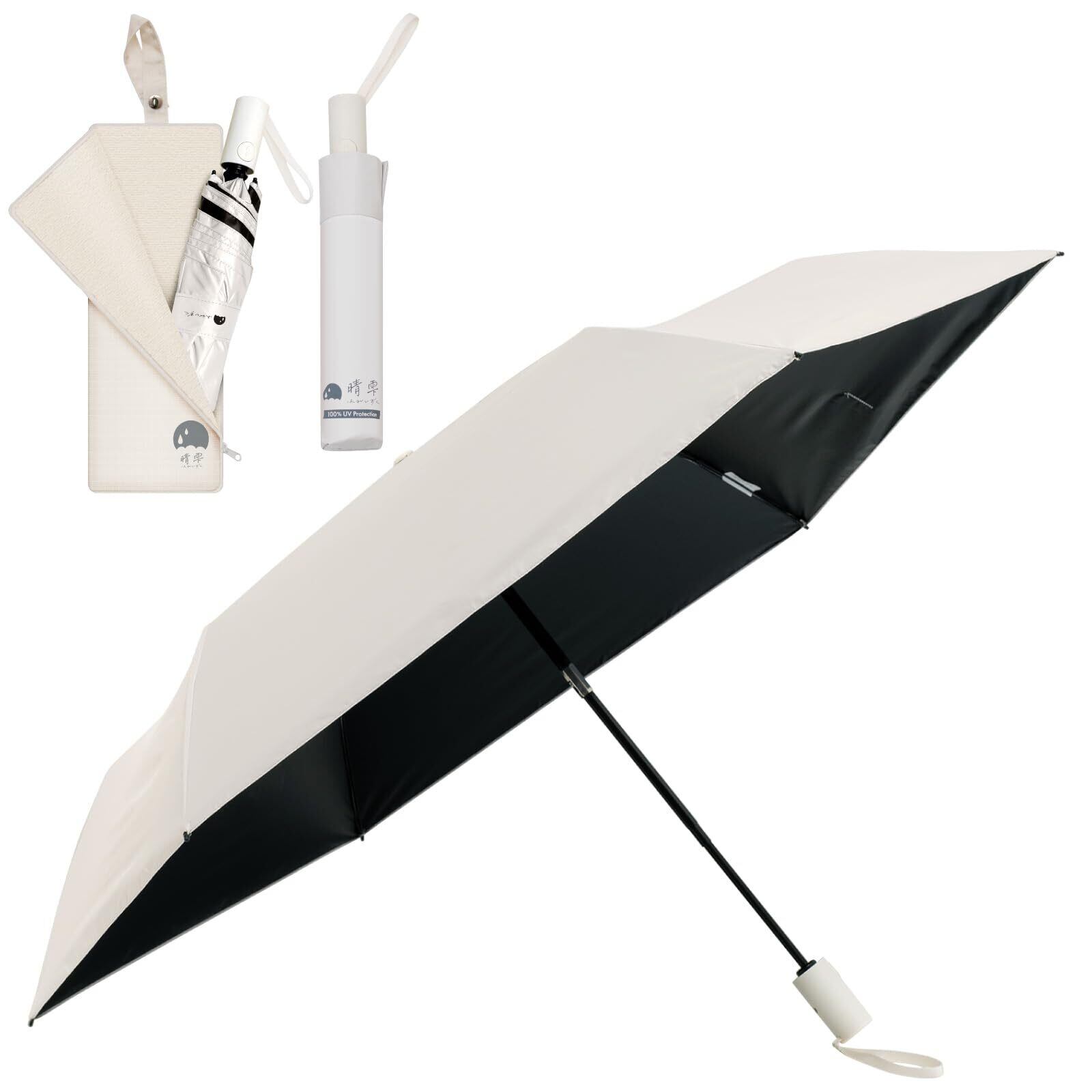 【晴雫(はれしずく)とは】晴雫は、猛暑・紫外線・梅雨のすべてに対応する、超軽量・高機能の折りたたみ日傘。日差しにも雨にも強く、あらゆるシーンで活躍します。【超軽量】直径97cm・完全遮光という機能を備えながら、本体重量はわずか約142g。スマホより軽い、驚異的な軽さを実現しました。※商品のコーティングは、性能を最大限に発揮するために丁寧に仕上げています。そのため、コーティング量の微細な違いにより、製造ロットごとに重量がわずかに異なる場合があります。 ▶▶▶ 日差しに強い!【完全遮光&UVカット率100%】本製品に使用している生地は、日本素材品質技術センター(QTEC)の評価でUVカット率100%・遮光率100%・UPF50+が認証されています。また、内側にブラックコーティングを施すことで、地面や壁からの照り返しも防ぎます。【遮熱率57%】しっかり遮熱!快適な日差し・猛暑・熱中症対策を実現。※記載のUVカット率・遮光率・UPF値・遮熱率は生地の状態での測定値です。 ▶▶▶ 雨降りに強い!【超吸水傘カバー付属】電車やバスでもサッと収納OK!内側のマイクロファイバーが水滴を吸収し、外側のはっ水加工でカバンの中をしっかりガード。ファスナーを全開にすれば、傘拭きとしても使えます。単品販売されている超吸水傘カバーと同等の性能を持つ傘ケースを付属しています。【はっ水度5級】JIS規格で最も高い基準をクリアした生地を使用。耐水圧10,000mm以上で、強い雨でもしっかりガード。※傘カバーははっ水性と吸水性を備え、水漏れしにくい設計ですが、状況により多少の水滴が染み出る場合があります。あらかじめご了承ください。 ▶▶▶ 【薄くて丈夫な上質生地 20D 400T】20D 400Tの高品質素材を採用。軽量でありながら耐久性が高く、折りたたみ傘特有のごわつきがなくスムーズに収納可能。なめらかで上品な質感が手に馴染みます。 【コンパクト】親骨55cm、直径97cm、弧長107cmのワイドサイズ。体全体をしっかり守る大きさで、大きな日陰を作れます。折りたたむと長さ23cmのスリムサイズでコンパクト。収納時は小さめバッグにもスッポリ収まります。 ▶▶▶ 【ポキポキする必要なし】簡単に開閉できる手開き式です。【ベルモンドについて】ベルモンドは福岡県に本社を置くブランドです。万が一、初期不良や不具合がございましたら、お気軽にお問い合わせください。迅速に対応いたします。