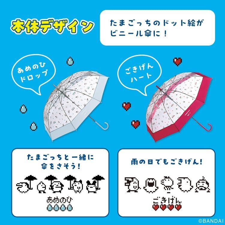 懐かしさにキュン!大人気「たまごっち」とWpc.がコラボレーション傘を差したキャラクターたちとしずくマークが散りばめられたデザインと、ごきげんな様子のキャラクターたちと、たまごっちのごきげん具合を表すハートが散りばめられたキュートなデザインです。